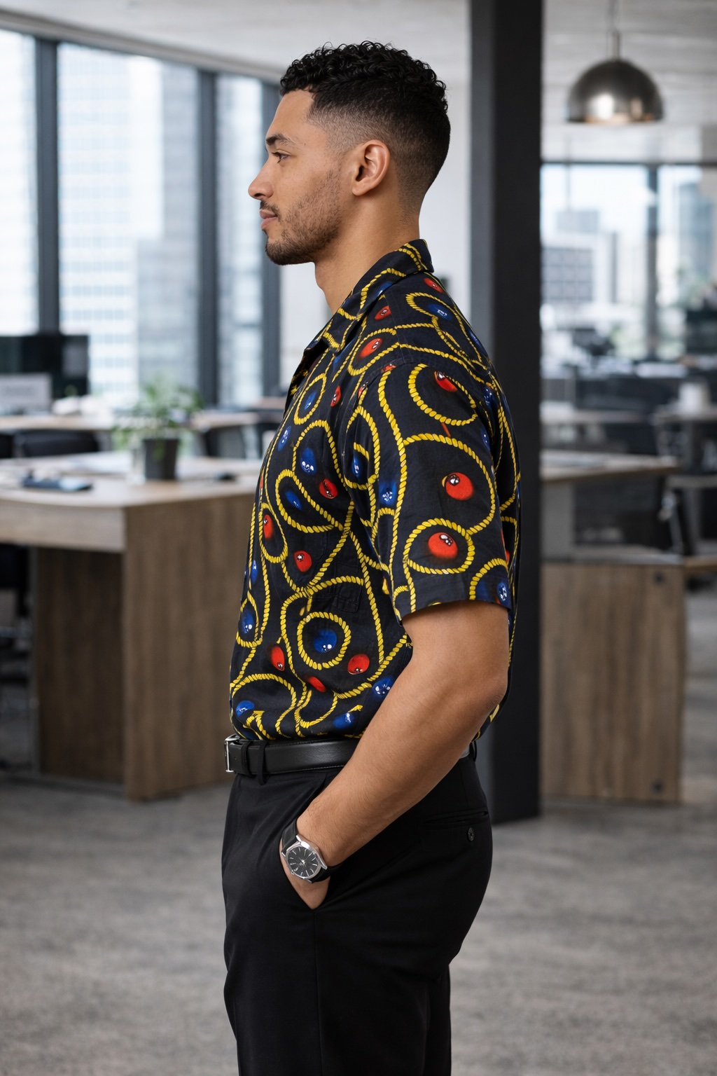 The standout feature is the eye-catching African-inspired print in black, yellow, red, and blue tones, arranged in bold circular and rope-like motifs for strong visual impact. The rich colour contrast and intricate detailing add depth and character to the design, elevating the overall look with a refined, artisanal finish.
