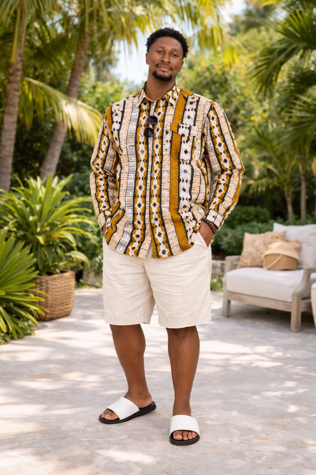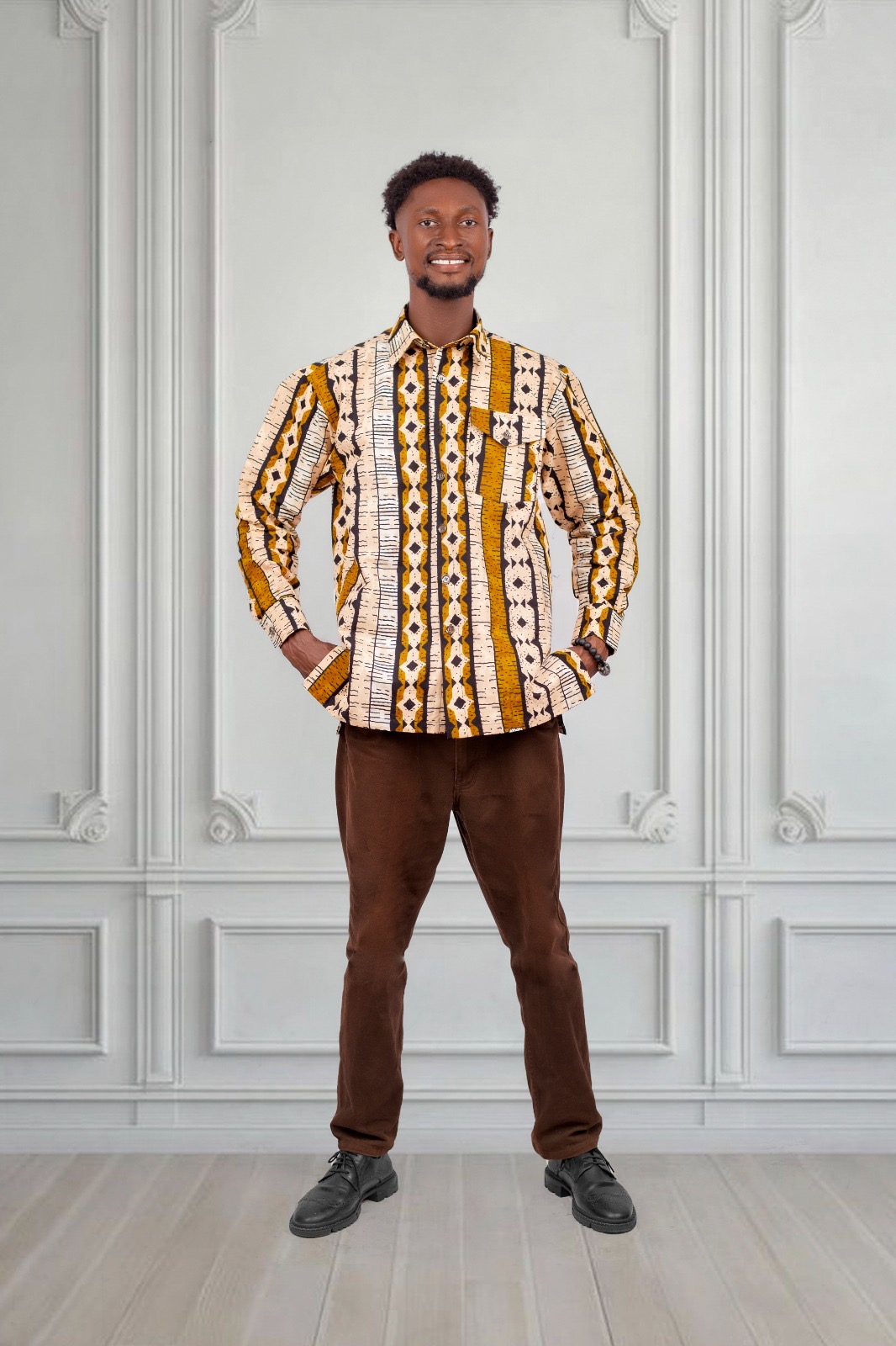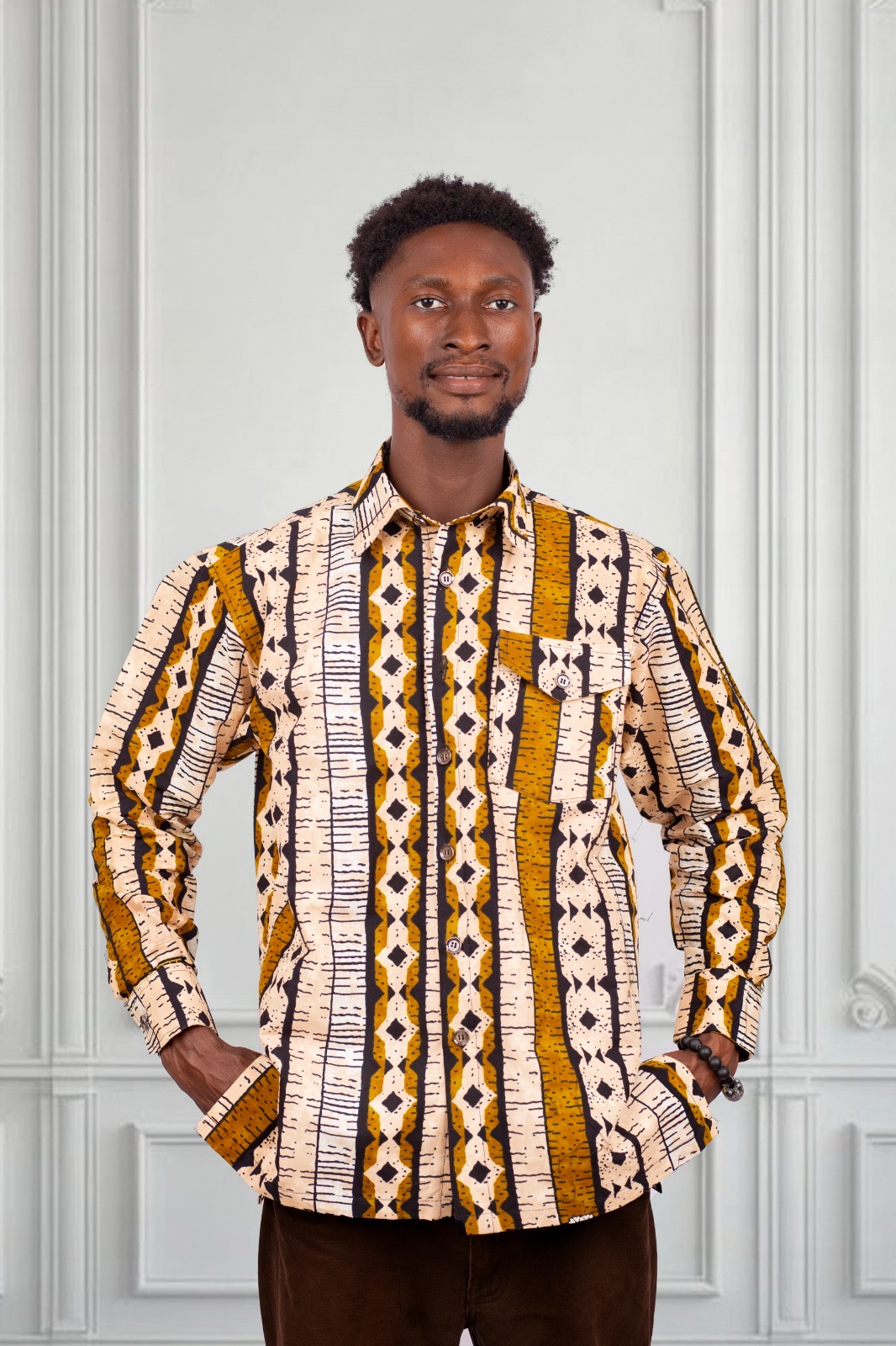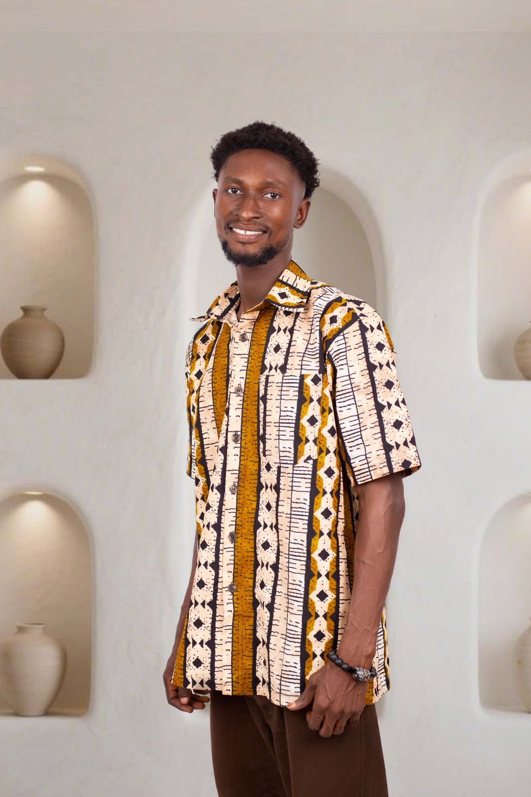 Step into effortless style with this Men’s African Print Shirt, available in both short-sleeve and long-sleeve options for versatile, year-round wear. This bold, culturally inspired piece is designed for men who appreciate originality, comfort, and modern African fashion. Featuring a beautifully detailed tribal pattern in warm mustards, browns, and ivory tones, it strikes the perfect balance between traditional artistry and contemporary tailoring.