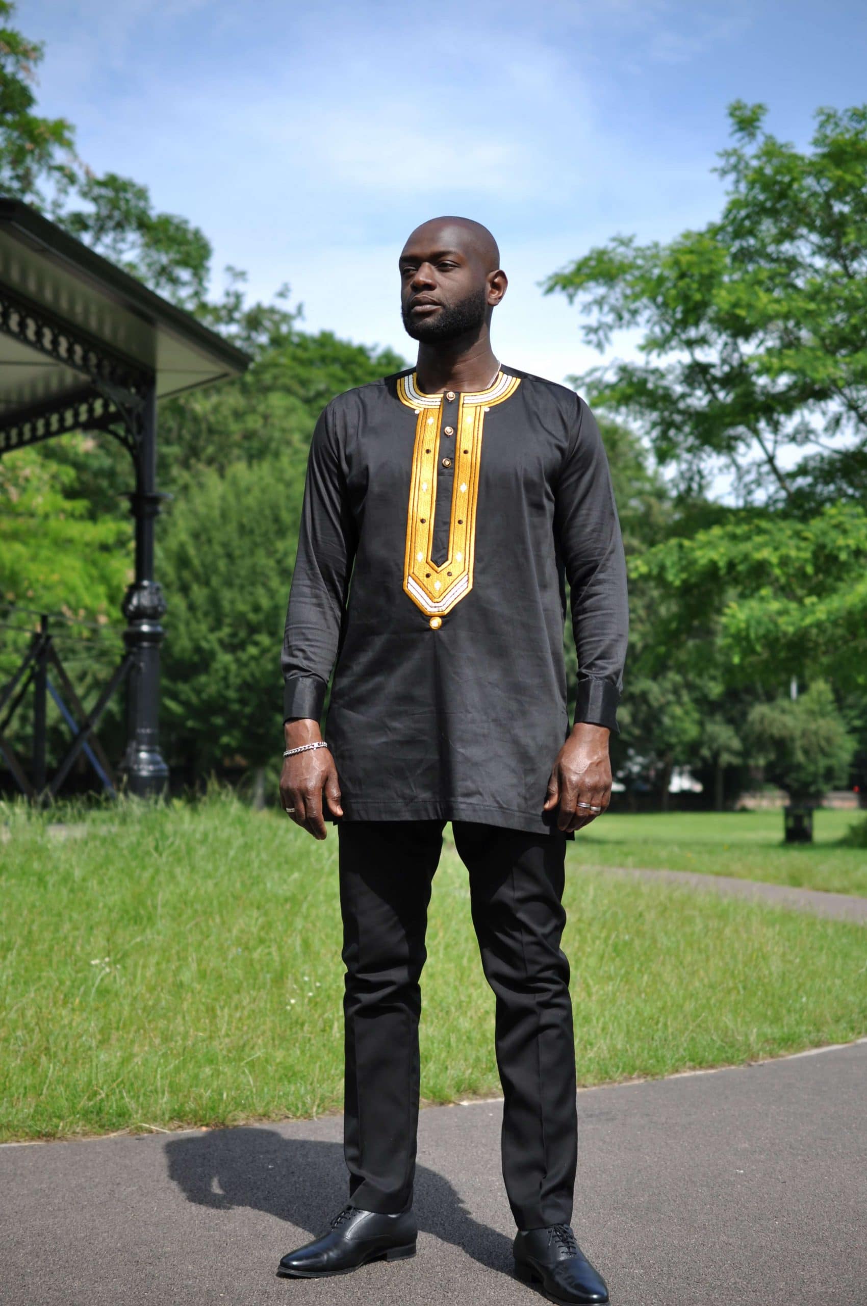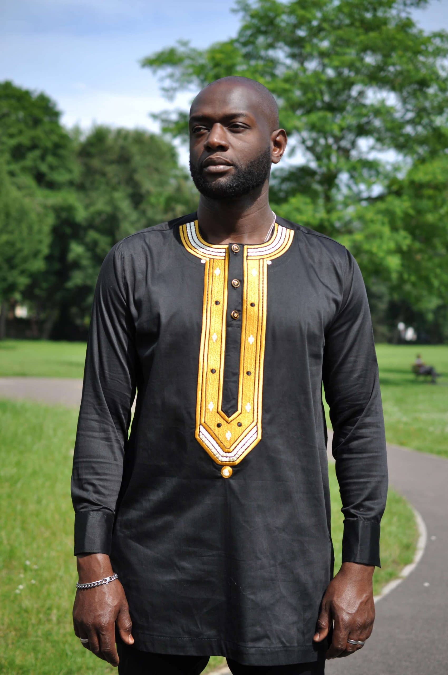 If placing a custom made order, please include your measurements with your order notes for this black and gold Amadi Men’s African Embroidery Shirt. Order in your usual shirt size and refer to our size guide. Use our measurement guide to help you measure accurately.