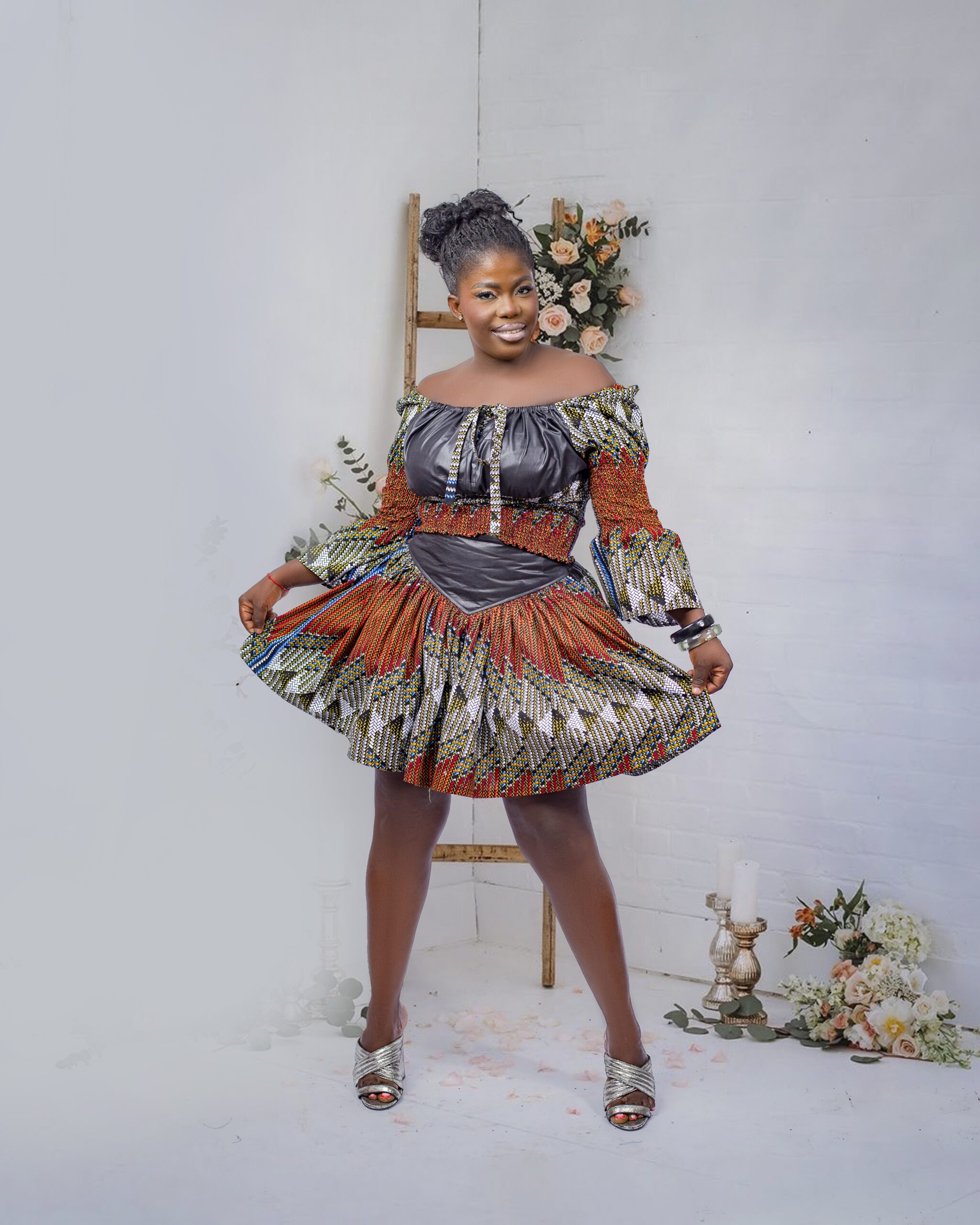 Moreover, its colorful pattern brings energy to any occasion — from summer parties to cultural gatherings. The short length adds a playful touch, while the layered skirt gives movement and charm to every step. Therefore, it’s your go-to choice when you want to look chic yet comfortable.