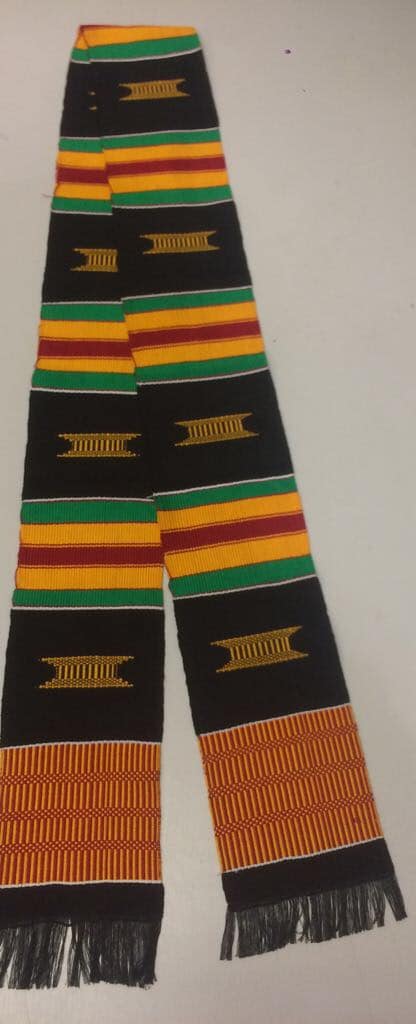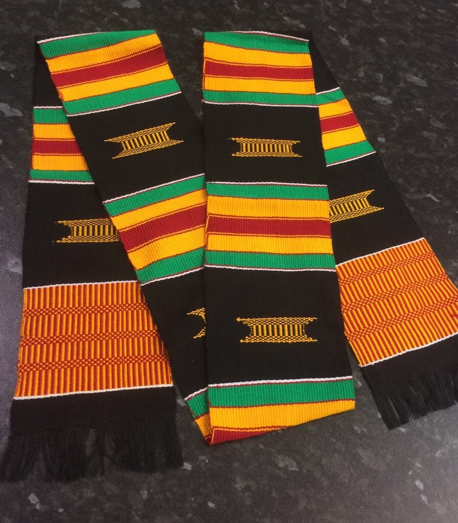 Add a touch of Afrocentric style to your look with our fabulous African Kente Muffler / Stole! Authentic and hand woven in Ghana, this woven muffler is perfect for special traditional events especially graduation ceremonies! This Kente muffler is multi-purpose so you can also use it as a scarf or sash.