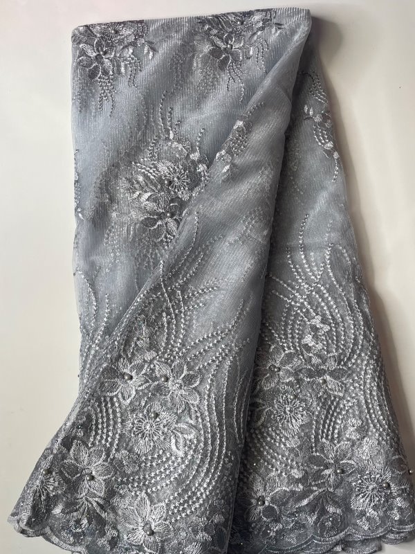 This beautiful Silver French Lace Fabric features embellished stones in the lace. Perfect for making dresses, tops, skirts, blouses or trousers, or any outfits and is very high quality. Featuring beautiful patterns and embellishments, this Silver French Lace Fabric can be lined with any fabric of your choice. It comes in 5 yards. This lace can also be shipped worldwide!