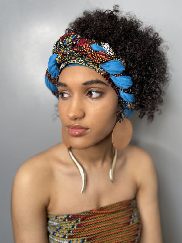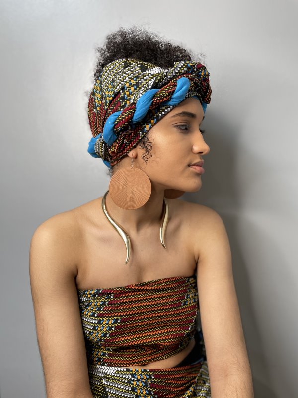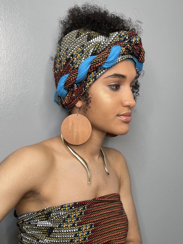 Add colour and pizzazz to your outfit with our stunning, blue African print head wrap and earrings gift set. Use as a neck scarf / shawl, style into an elegant turban or create many different head wrap styles. Ideal as a unique African gift for her. This headwrap comes with beautiful wooden African earrings to complete the set.