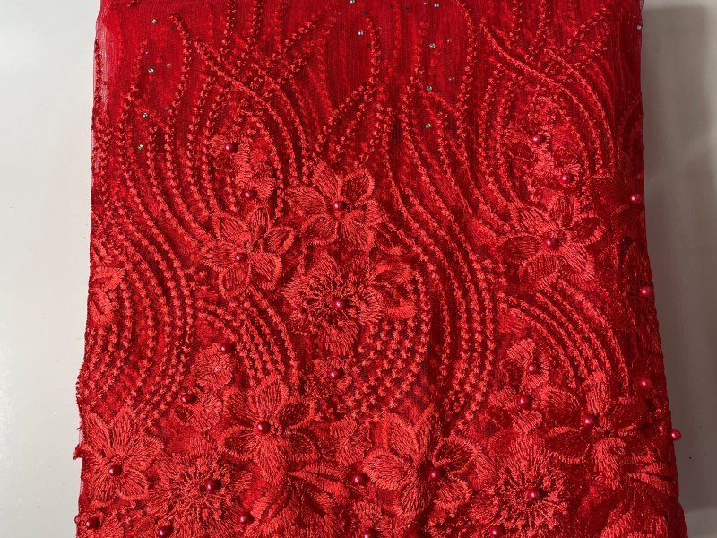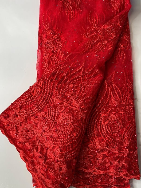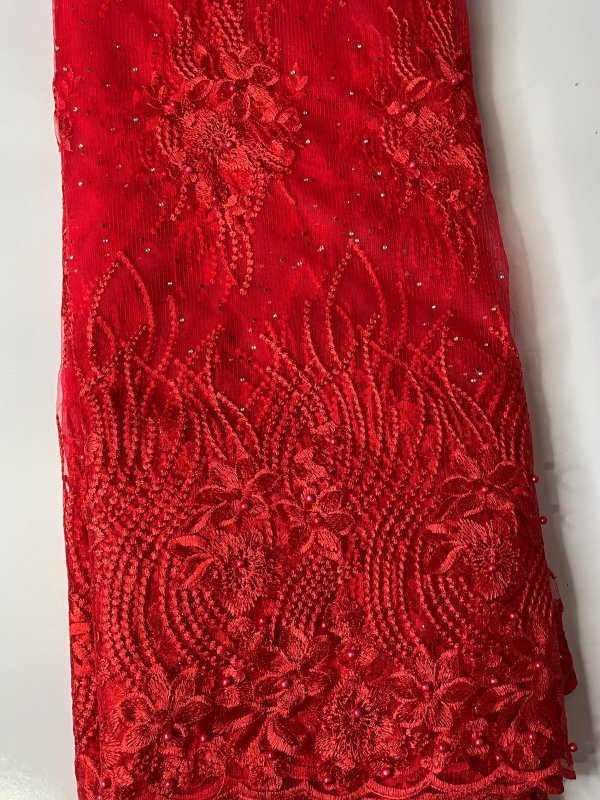 This beautiful Red French Lace Fabric features embellished stones in the lace. Perfect for making dresses, tops, skirts, blouses or trousers, or any outfits and is very high quality. Featuring beautiful patterns and embellishments, this Red French Lace Fabric can be lined with any fabric of your choice. It comes in 5 yards. This lace can also be shipped worldwide!