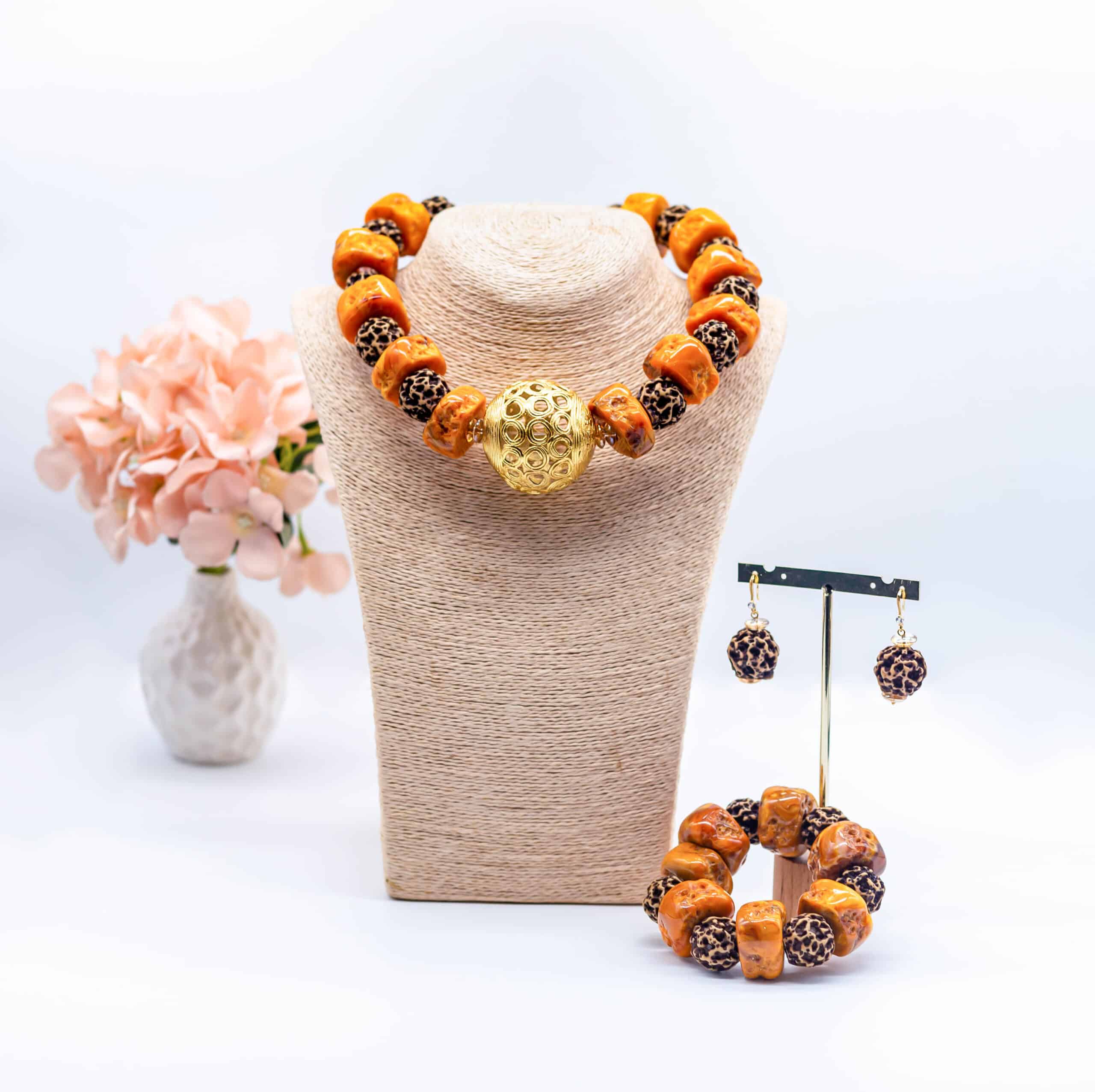 Furthermore, the warm tones of brown and orange in the beads beautifully accentuate any plain top, creating a sophisticated and harmonious look. Elevate your style effortlessly by pairing it with a plain dress and heels for an elegant and refined appearance. The inclusion of a brass ball and coral beads underscores our commitment to unique and stand out pieces.