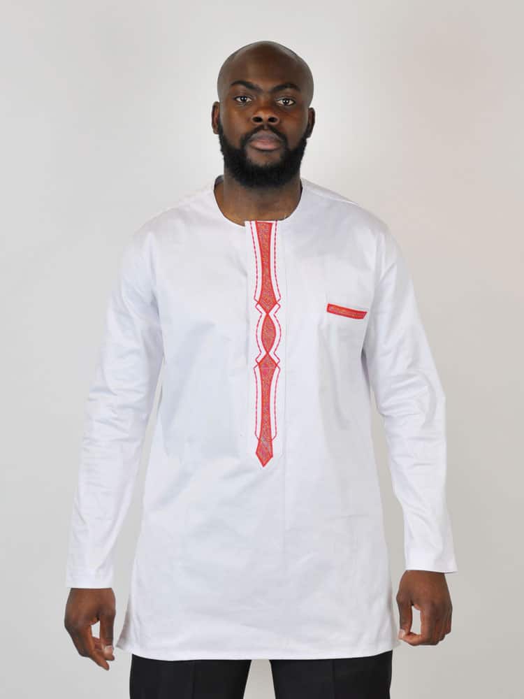 Looking for a traditional African shirt? Then this men’s white African shirt with beautiful embroidery is the perfect choice for you! Ideal for any occasions such as weddings, engagement parties and other similar outings. This shirt is available in two colour choices: white with gold embroidery or white with red embroidery. Worldwide Shipping is available and we also offer free delivery in the UK!