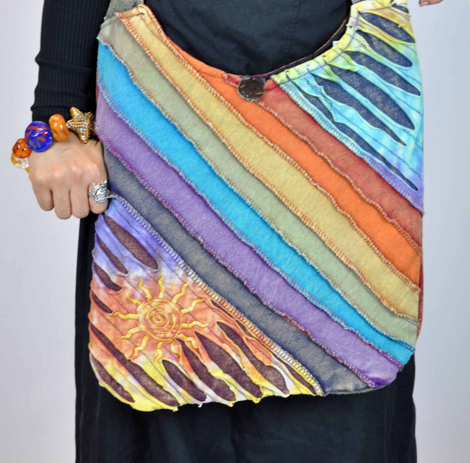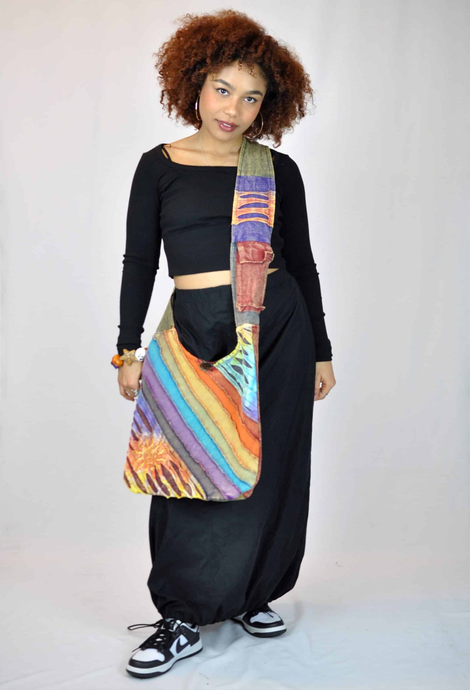 Our Hippie style Dabir Patchwork Bag is the perfect gift for a loved one or even to treat yourself. The bag is a unique and stylish with its multi-colour patchwork design. Moreover, the bag has a pocket on the strap of the bag for extra storage. In addition the bag has a beautiful rainbow design on its front.