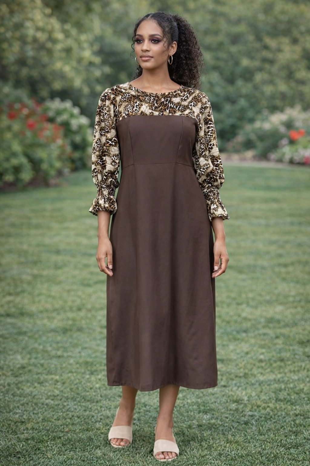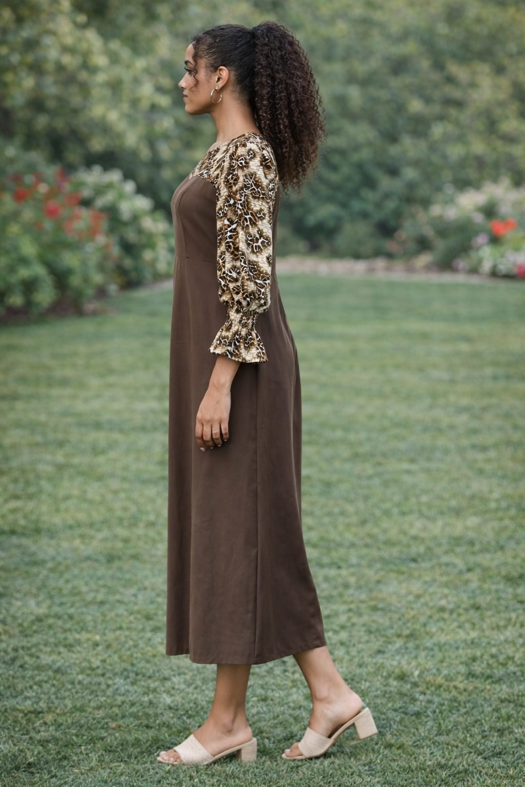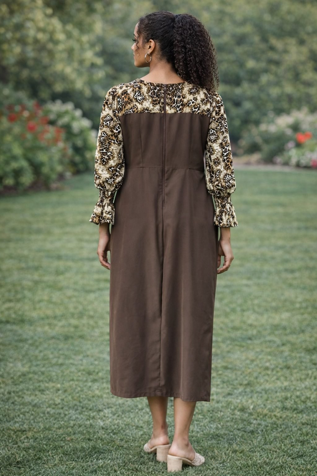 The upper section and sleeves feature a stylish animal print pattern that instantly adds character to the dress. These details bring texture and depth to the overall design. In addition, the earthy tones of the print blend beautifully with the deep brown fabric.