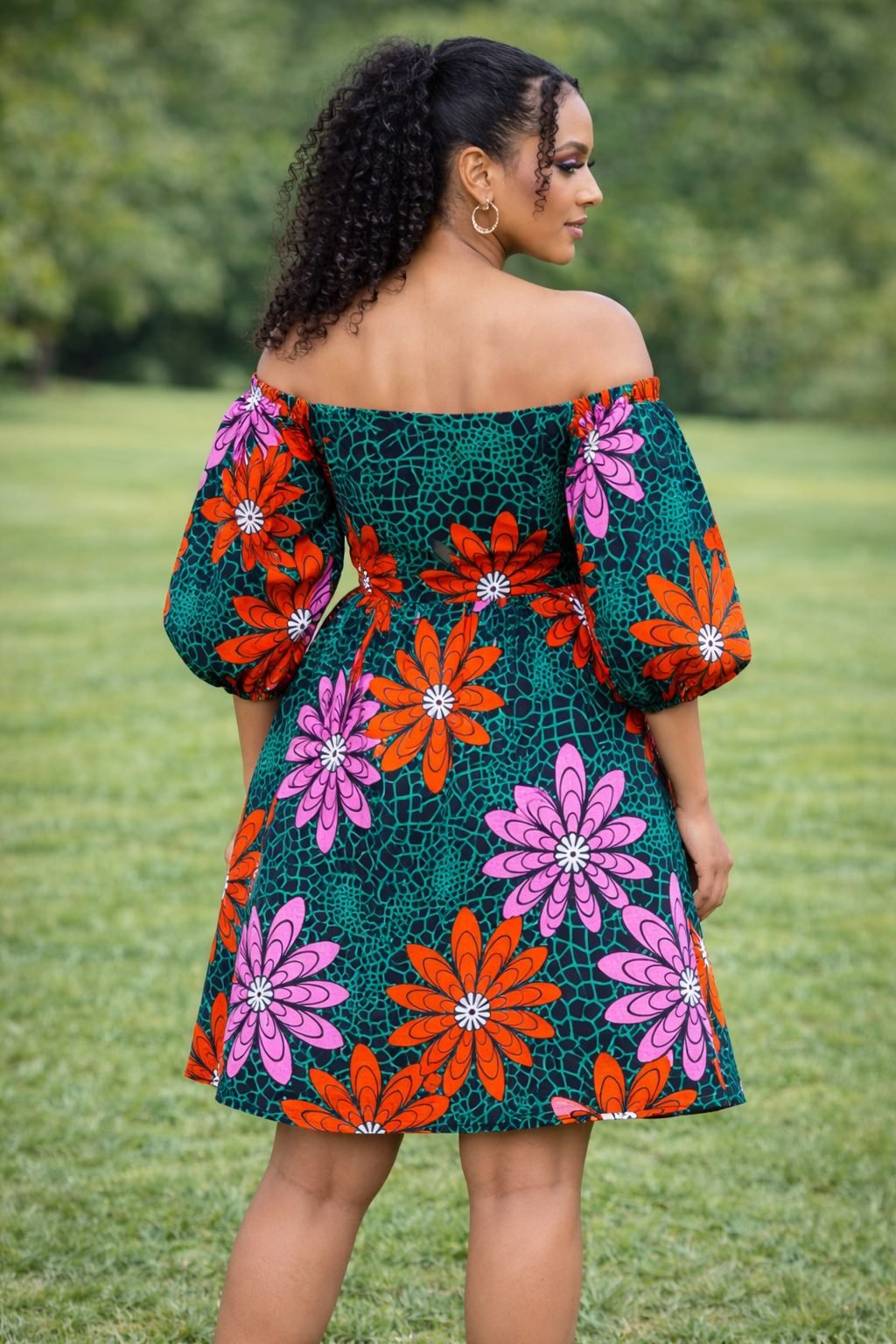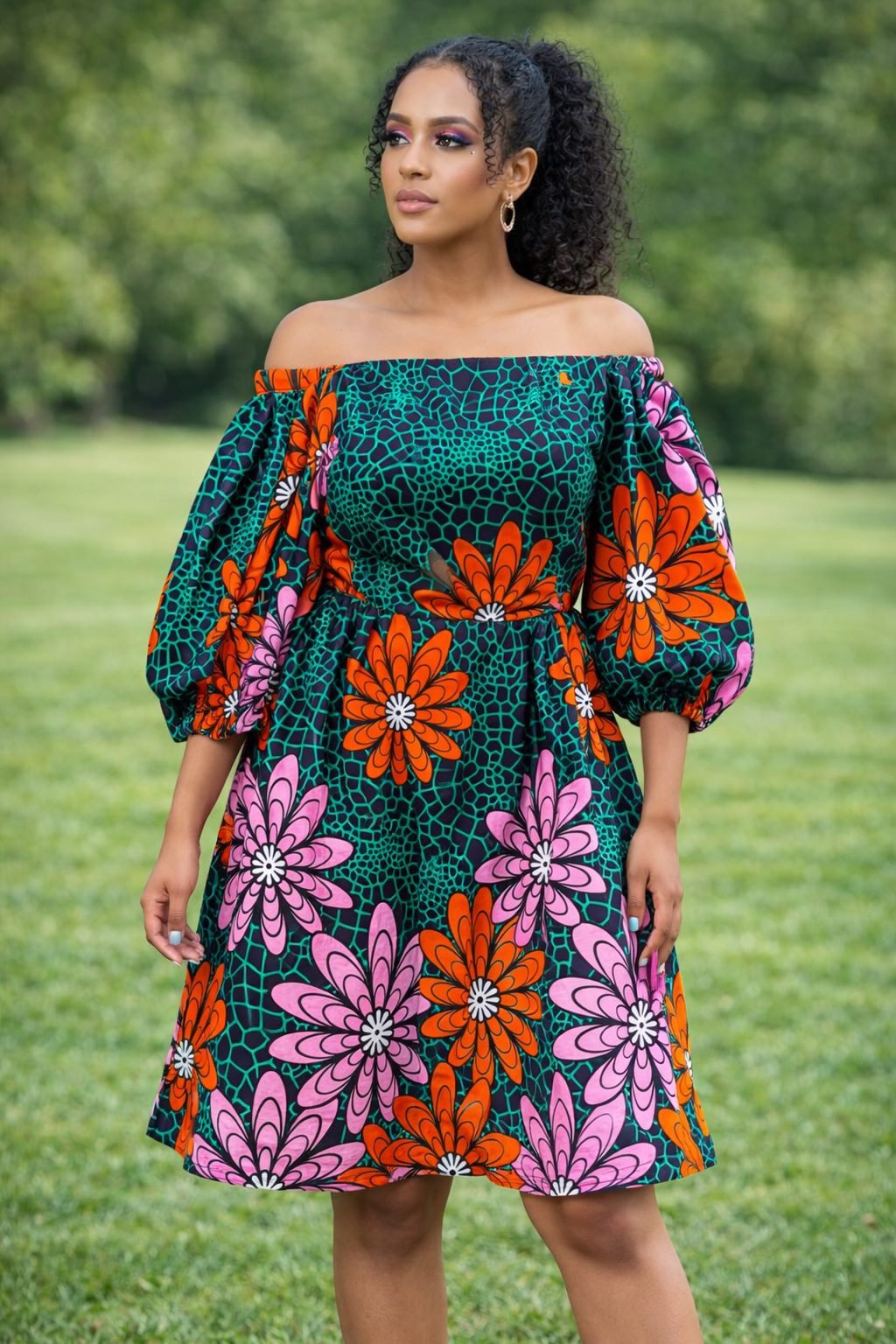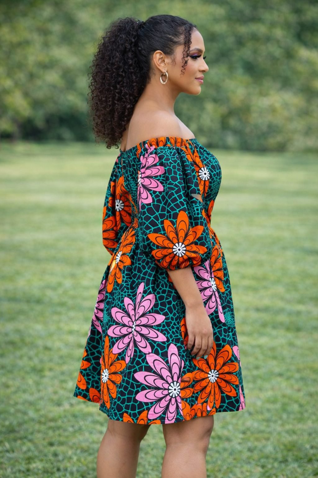 Step out in confidence with this beautiful Off-Shoulder African Print Floral Dress. It blends bold Ankara style with modern elegance. The vibrant floral pattern stands out instantly. As a result, the dress creates a striking and memorable look.