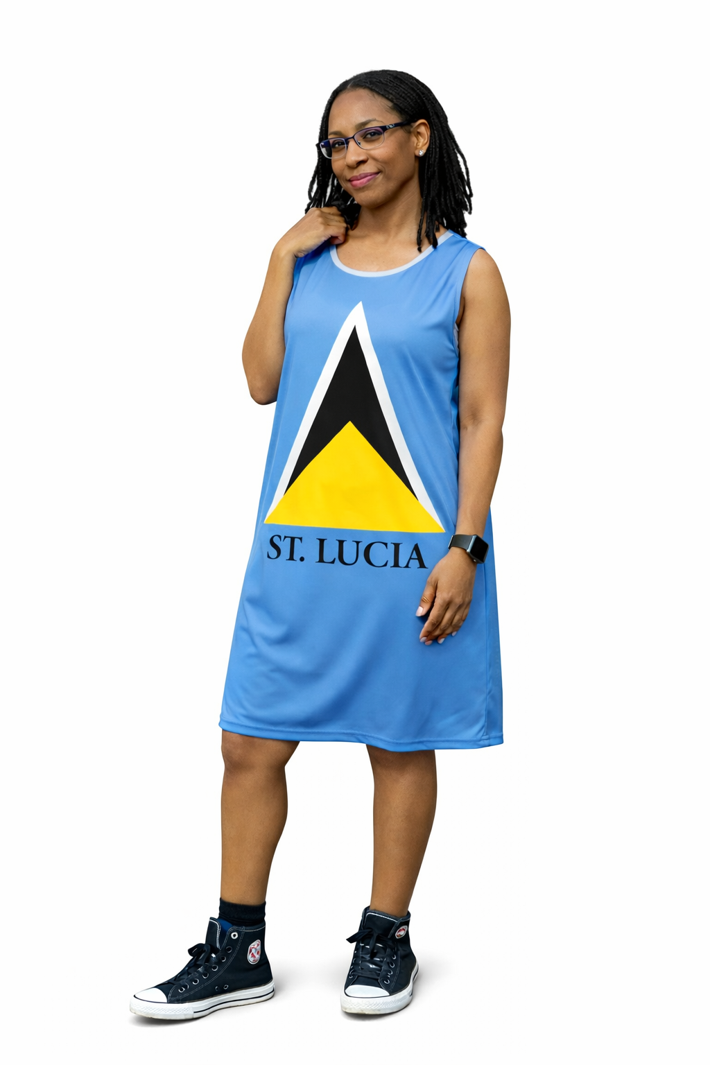 Designed with a sleek, body-flattering silhouette and a comfortable shift fit, this sleeveless dress hugs in all the right places while keeping you cool and confident. Whether you’re heading to a festival, beach party, cultural celebration, or just want to rep your roots in style, this dress brings the energy of Saint Lucia everywhere you go.
