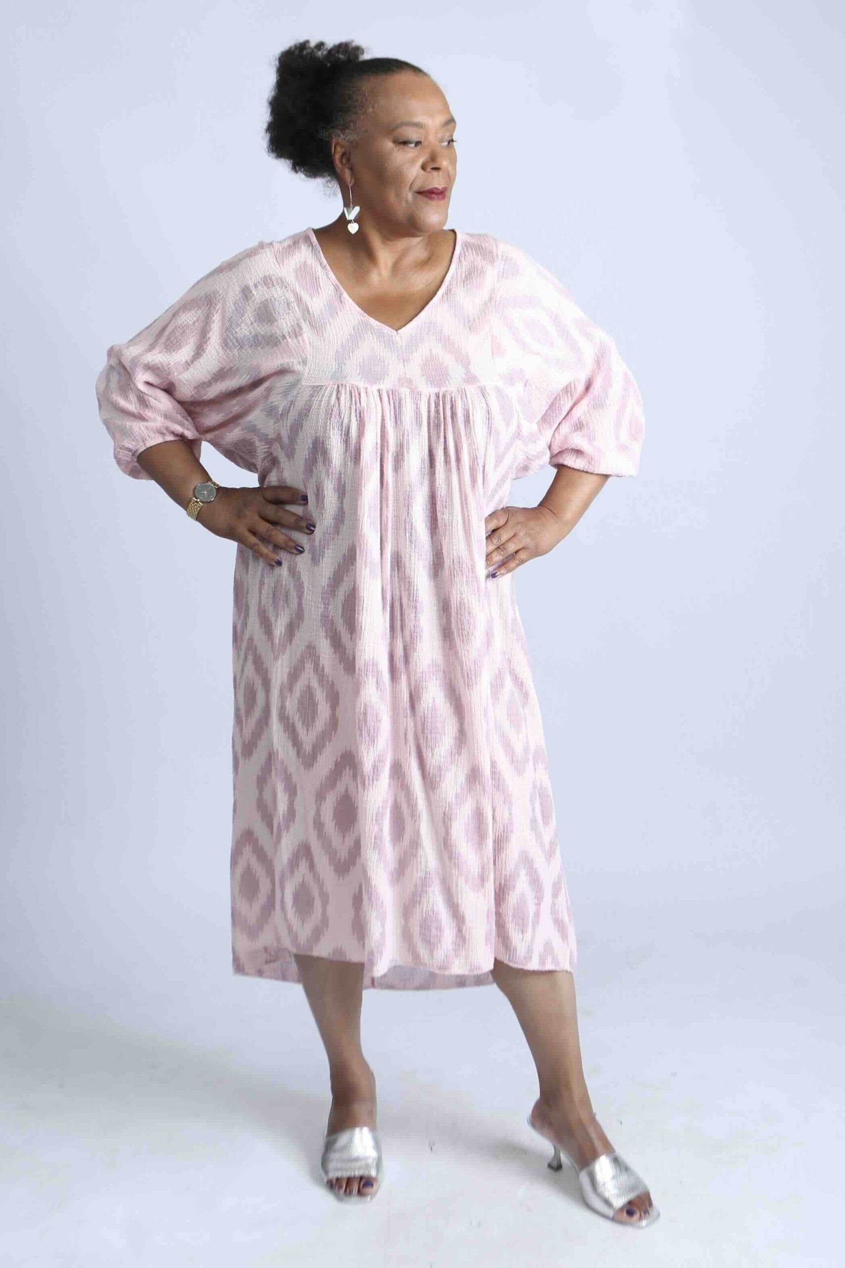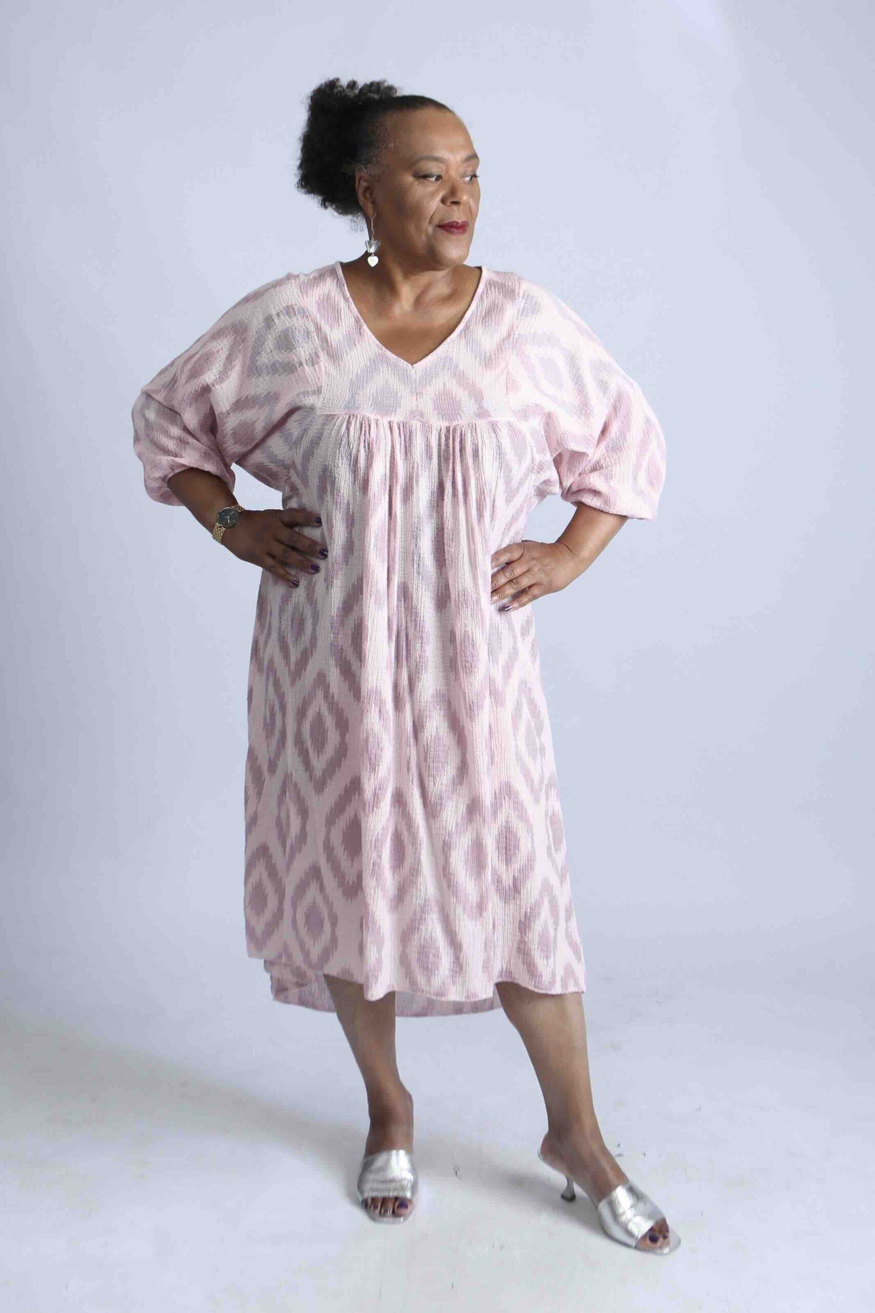 - 3/4 sleeves and shin-length cut for comfort and ease
