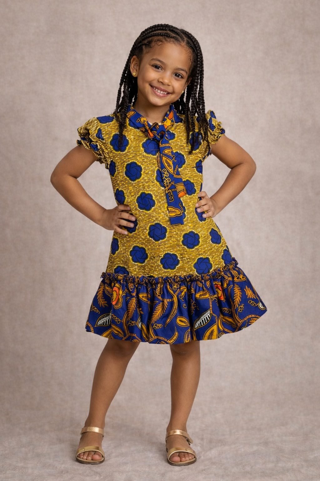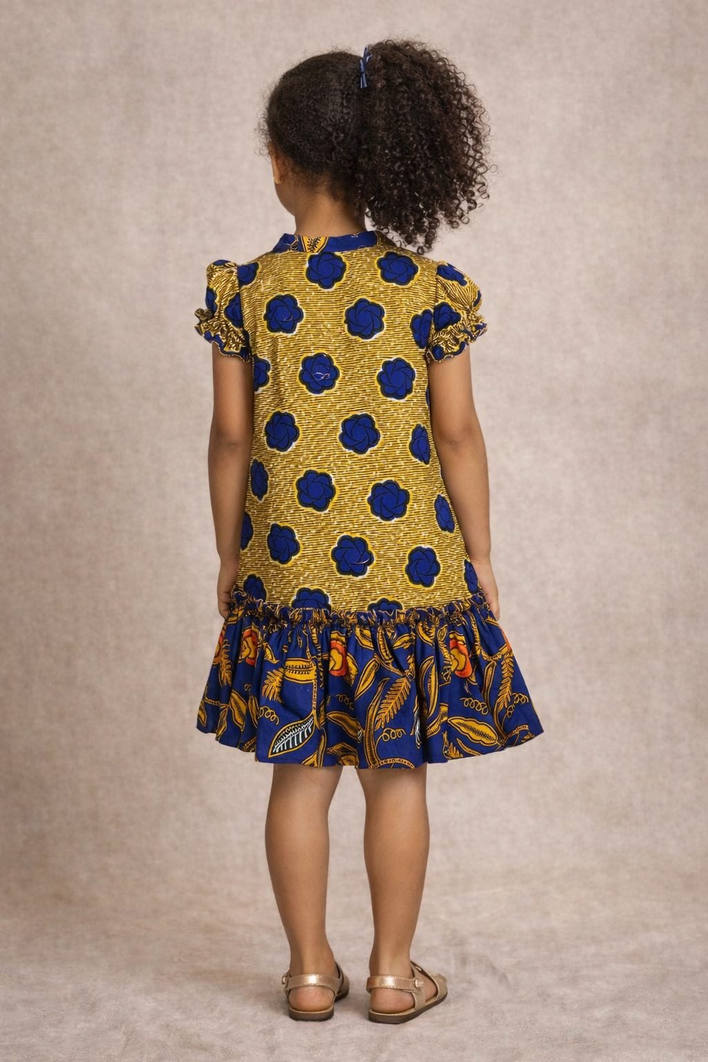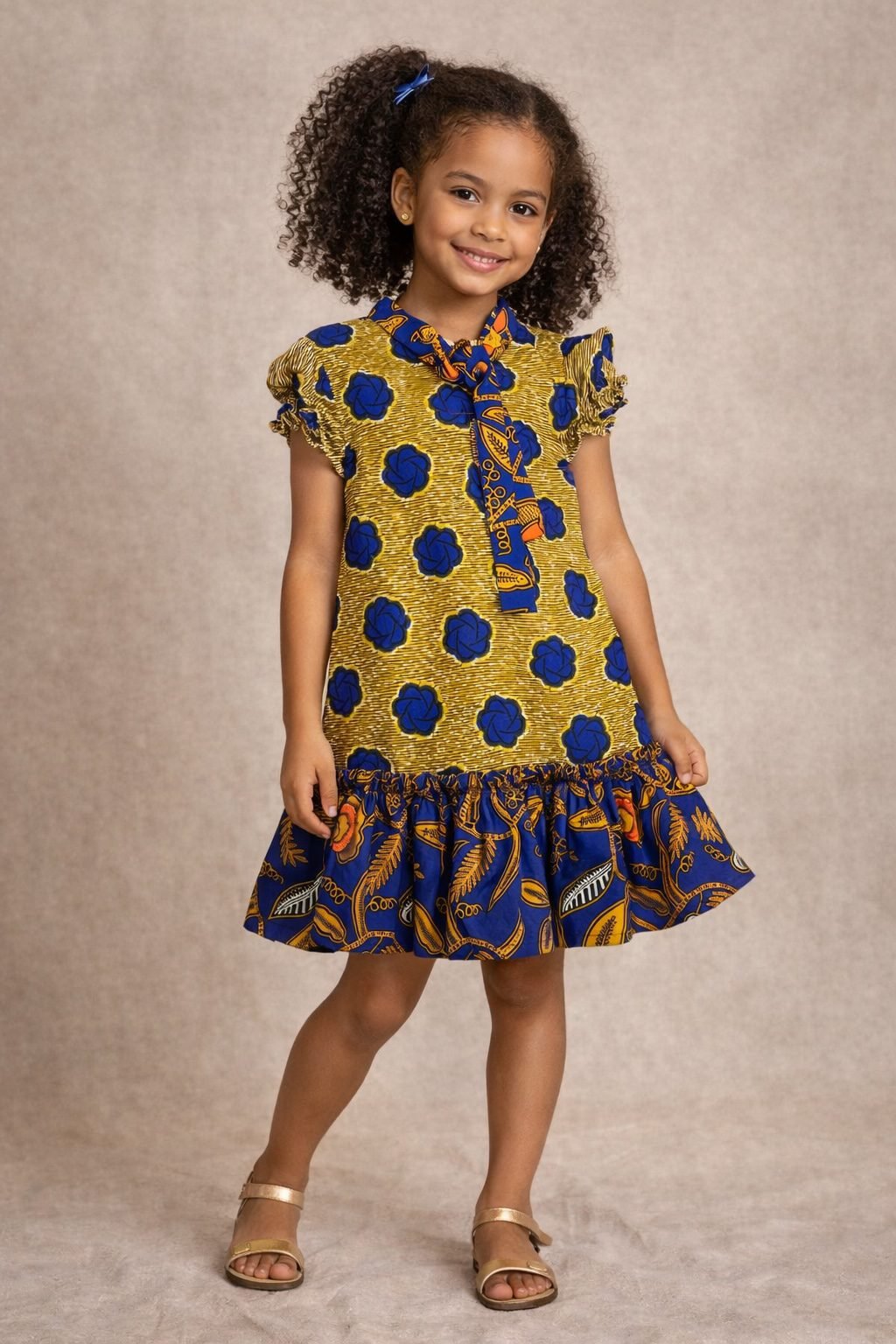 Let your little one shine in this beautiful Girls African Print Dress. It blends culture, comfort, and playful style. The rich gold base with bold blue Ankara-inspired print creates a striking look. As a result, it stands out beautifully for both everyday wear and special occasions.
