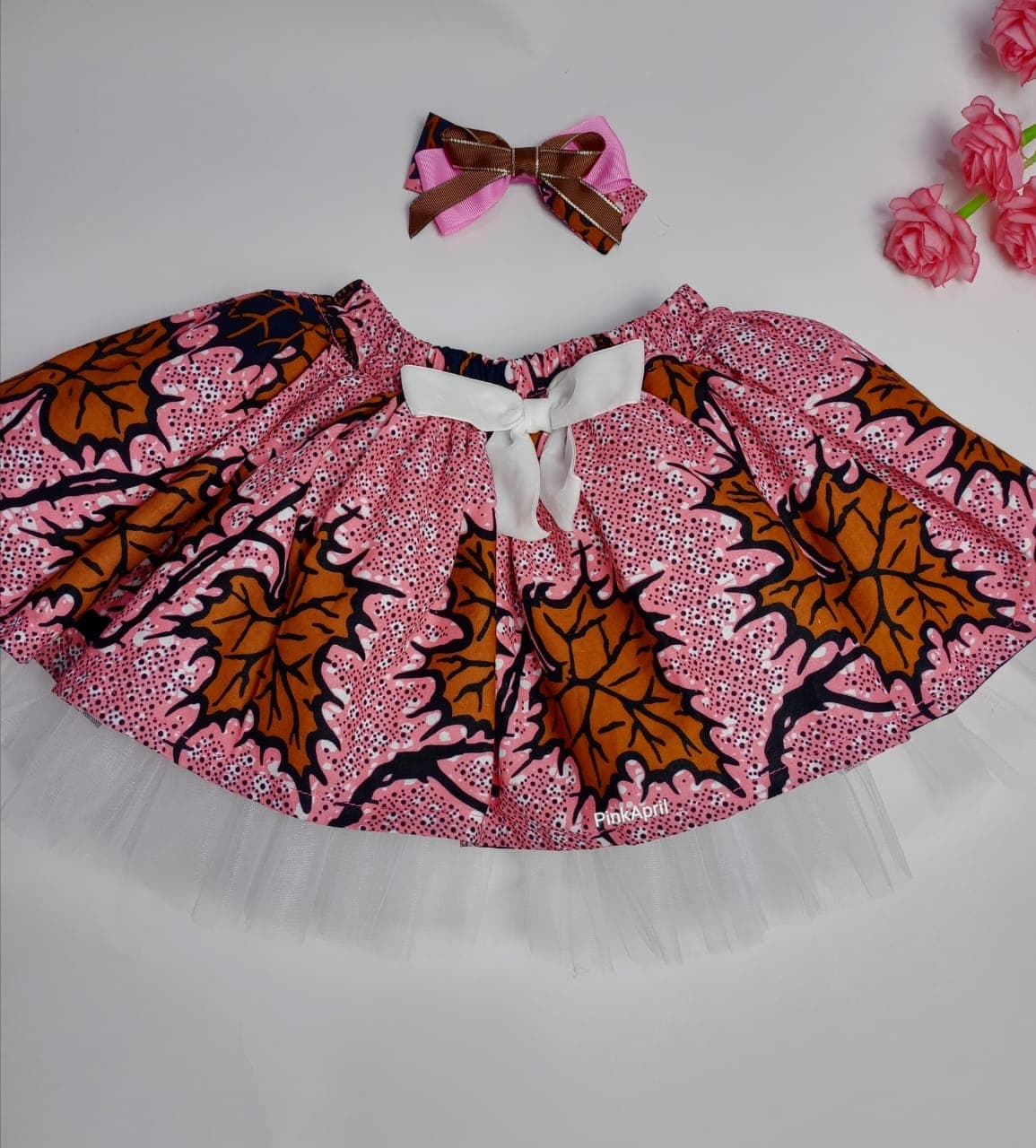 The Gheche Ankara Kids Bow & Skirt Set, is beautifully vibrant with Ankara print. Here, the skirt has an autumn like pattern with an array of Orange leaves scattered on the beautiful Ankara print. Moreover, the skirt has a bow on its waistline and skirt is lined with tulle for a full, poofy look. This outfit is appropriate for all seasons. In addition this set looks great with boots and a warm sweater in the winter and with a vest and sandals in the summer.