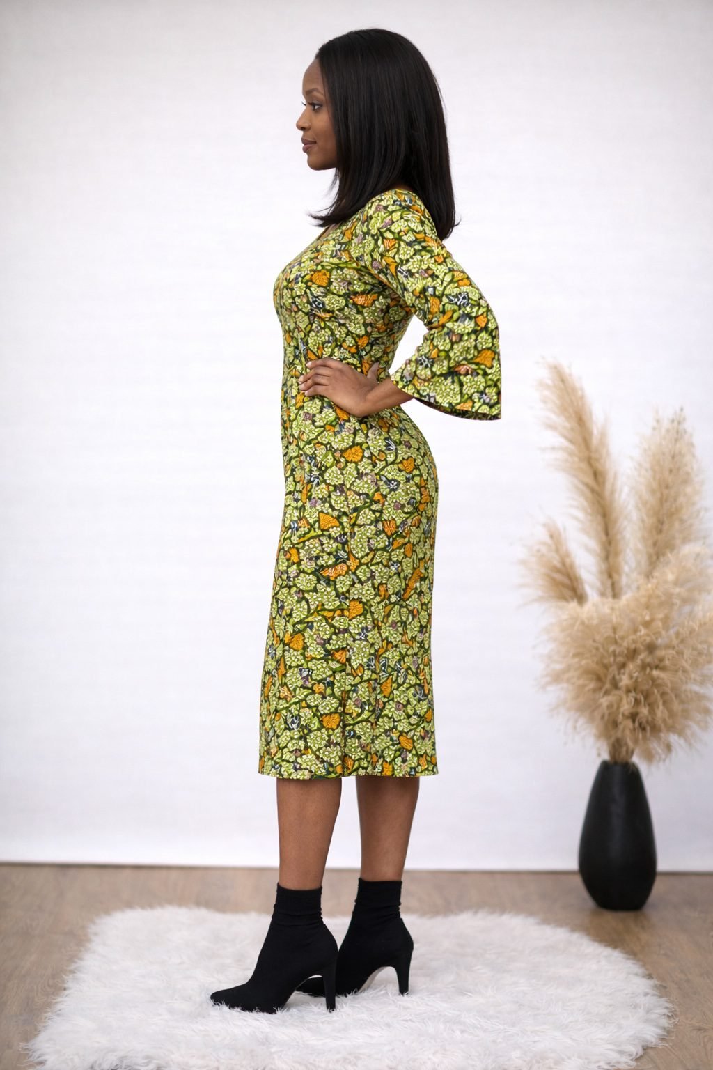 This green African print midi dress blends vibrant pattern with a clean, tailored shape. The rich green base is enhanced by warm orange and subtle blue floral details. As a result, the design feels lively yet balanced. At the same time, the fitted silhouette keeps the overall look refined and polished. Therefore, you can wear it confidently for both day and evening occasions.