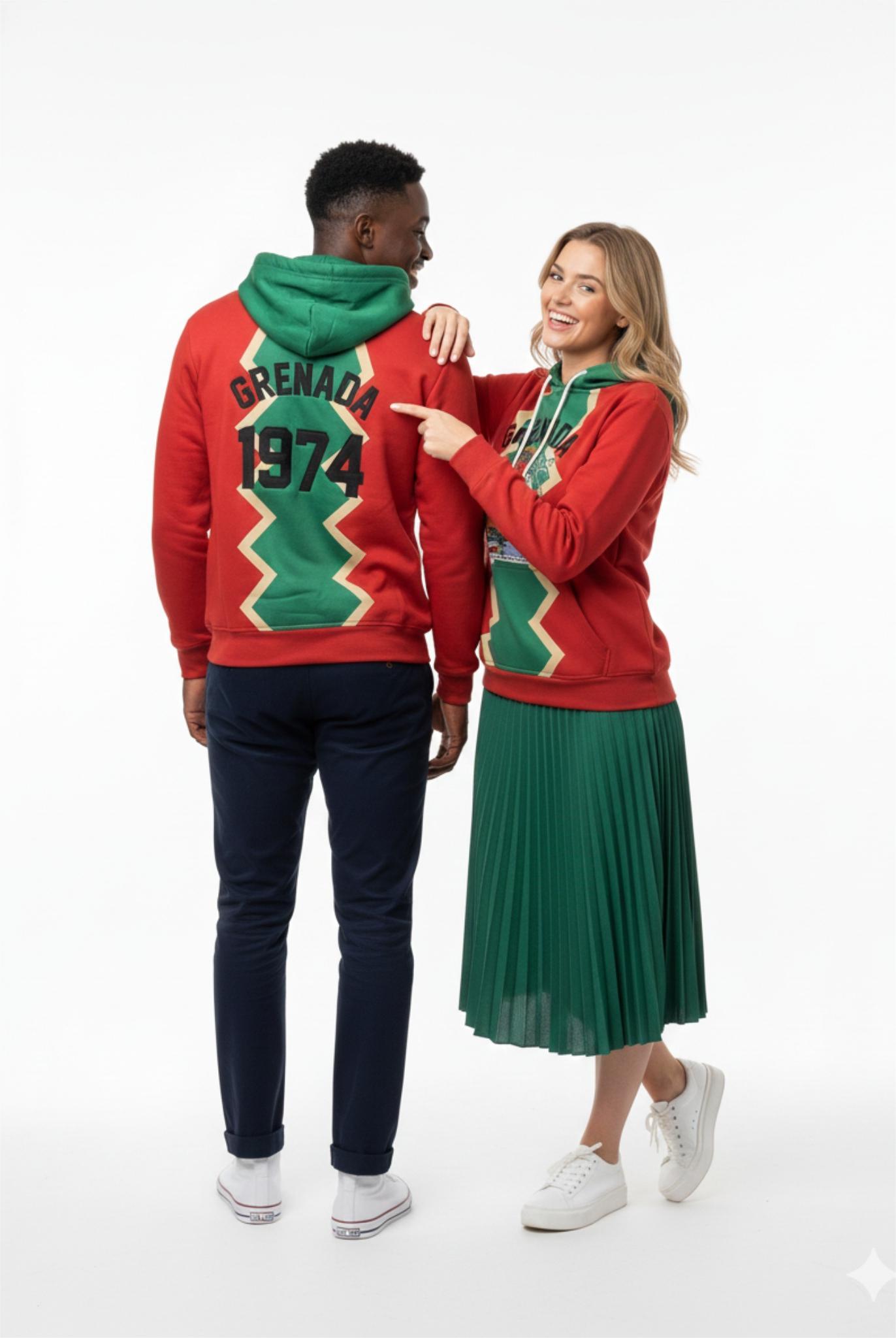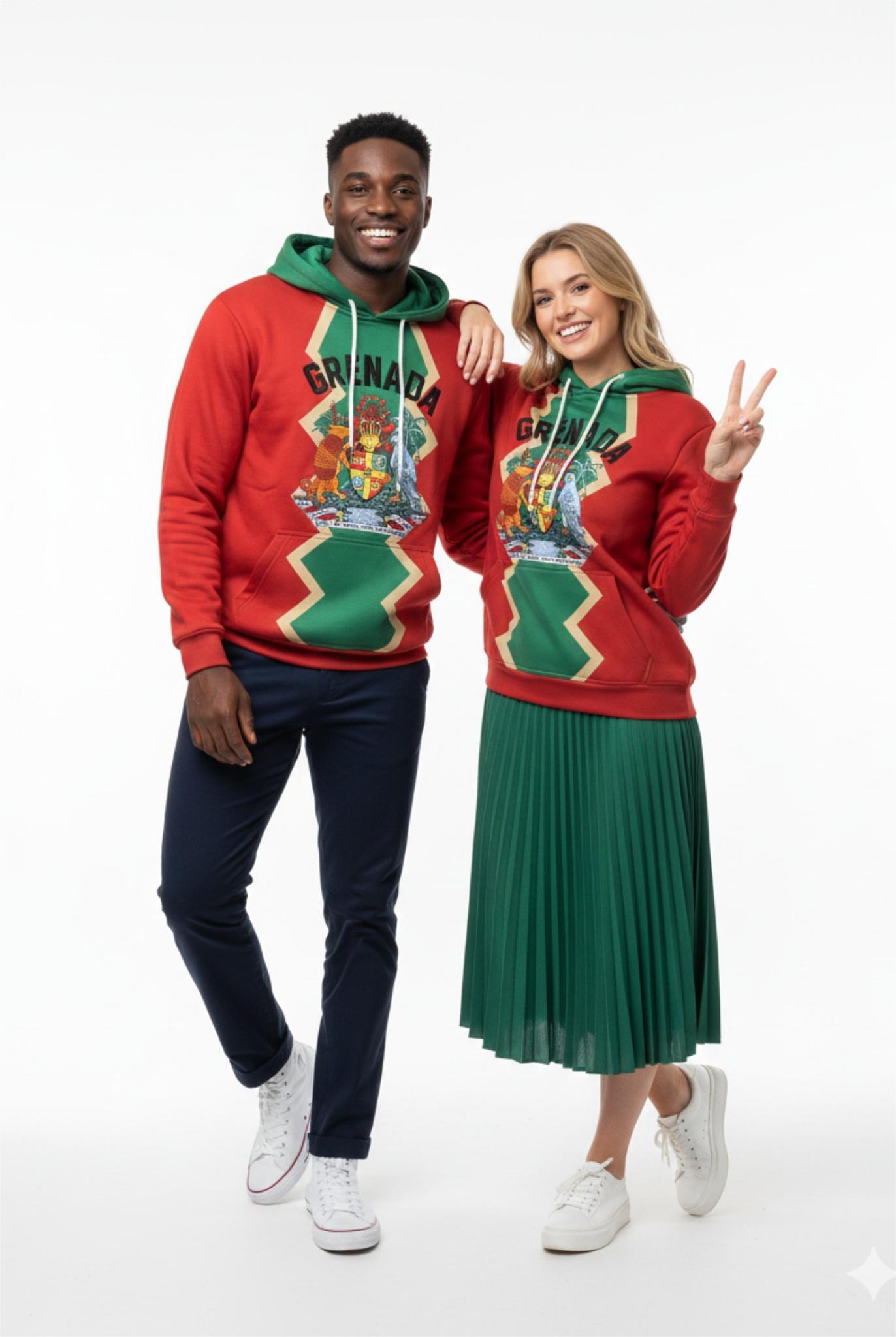 Make a confident cultural statement with this Grenada Flag Graphic Hoodie, a standout piece designed to combine heritage-inspired design with everyday comfort. Crafted for those who appreciate both style and meaning, this hoodie showcases a bold red base contrasted with deep green detailing and a striking Grenada crest-inspired graphic at the centre. The design draws on the colours and symbolism of the Grenadian flag, creating a visually impactful yet wearable garment.