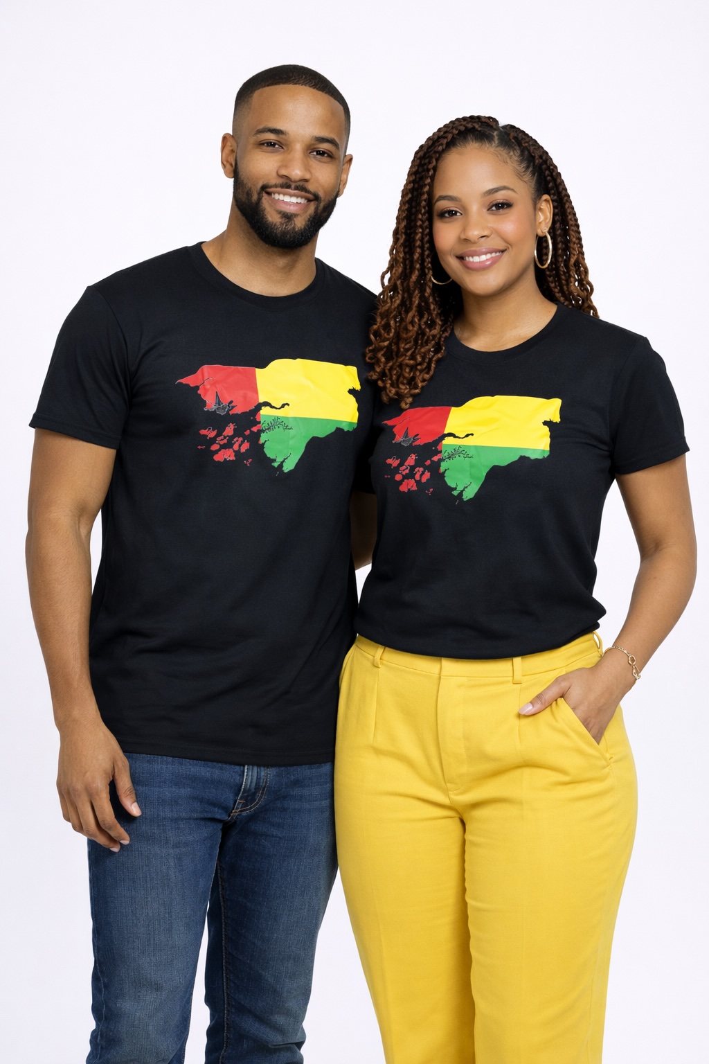 Each T-shirt features a classic black base, allowing the bold colours of the Guinea-Bissau flag to stand out clearly at the centre. More than just the flag colours, the design also includes the authentic shape of Guinea-Bissau, making this top a meaningful representation of national pride and connection.