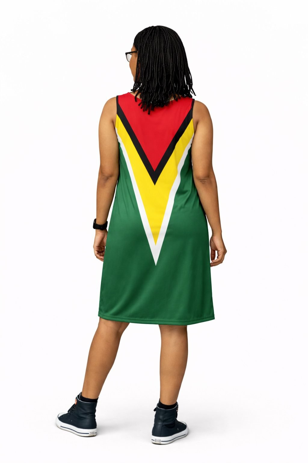 The standout feature is the bold Guyana flag graphic. The vibrant green base is complemented by striking red, yellow, black, and white detailing, creating strong visual impact. Moreover, the round neckline and sleeveless cut keep the look clean, modern, and timeless.