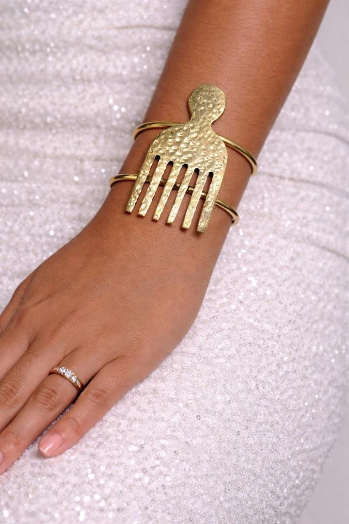 Hammered gold Afro comb cuff bracelet. Adjustable, lightweight, and symbolic jewelry that celebrates heritage, pride, and cultural style.