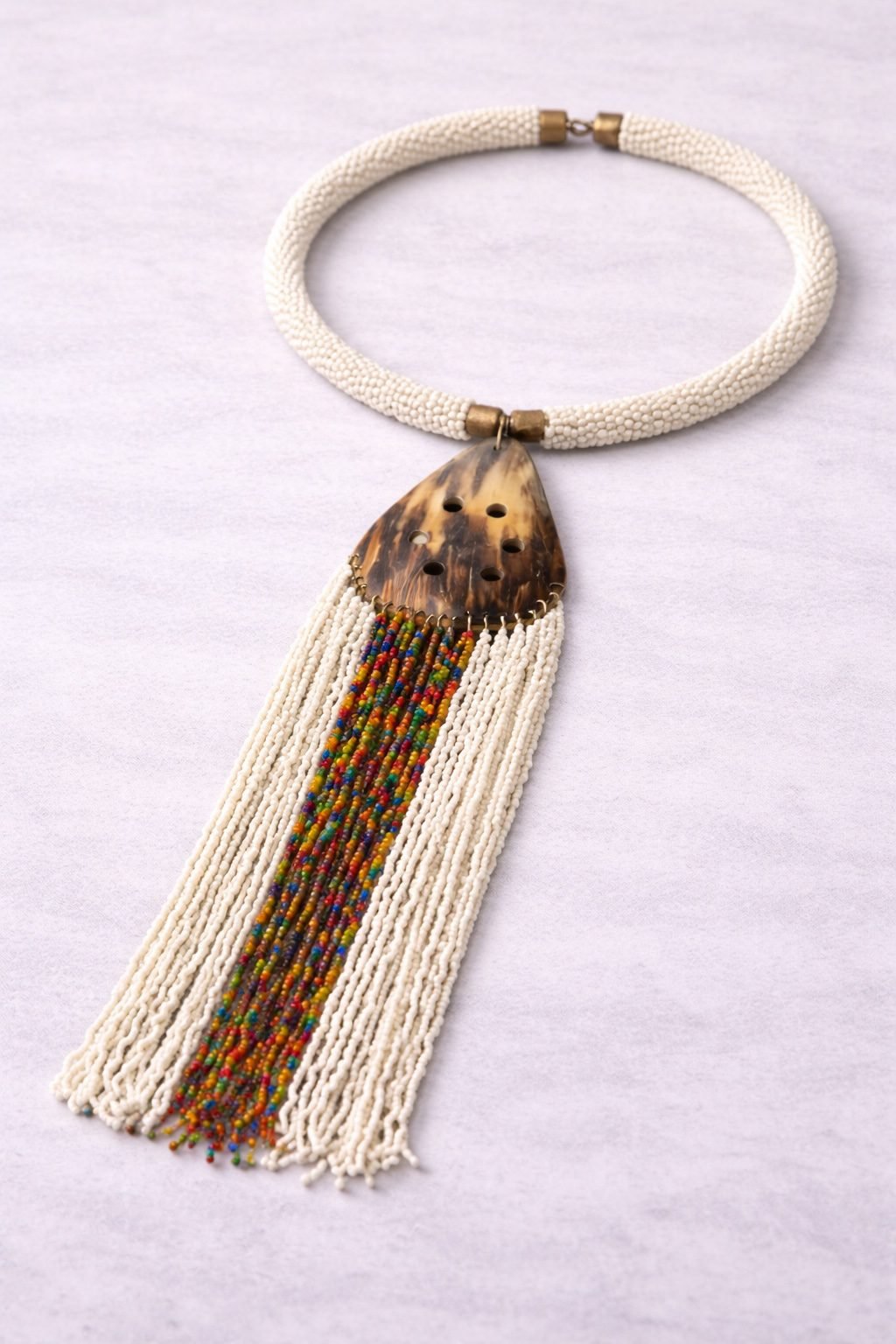 Customers love the combination of natural texture and vibrant beadwork. The fringe adds graceful movement, while the collar shape keeps the necklace easy to style and comfortable to wear.