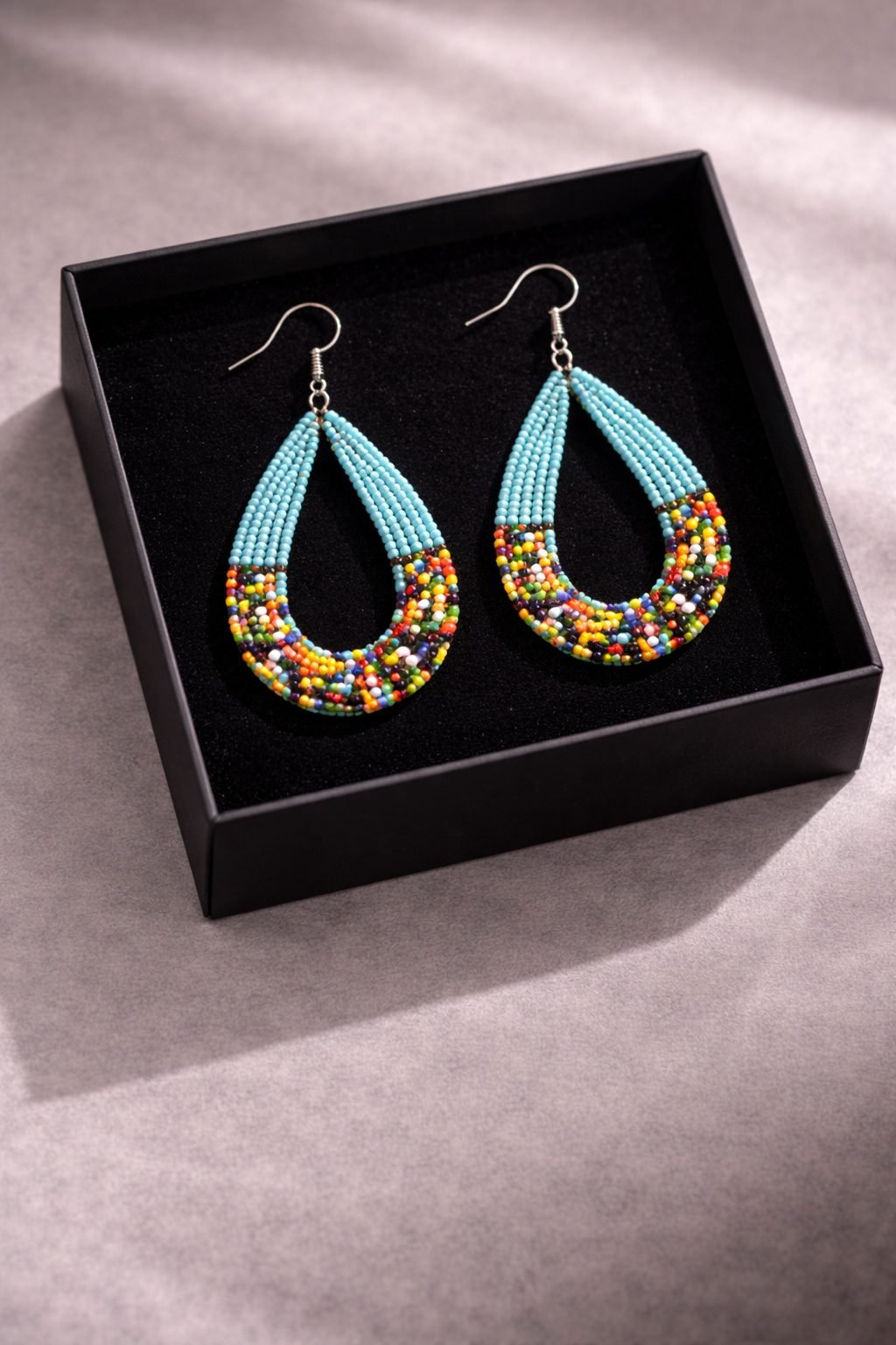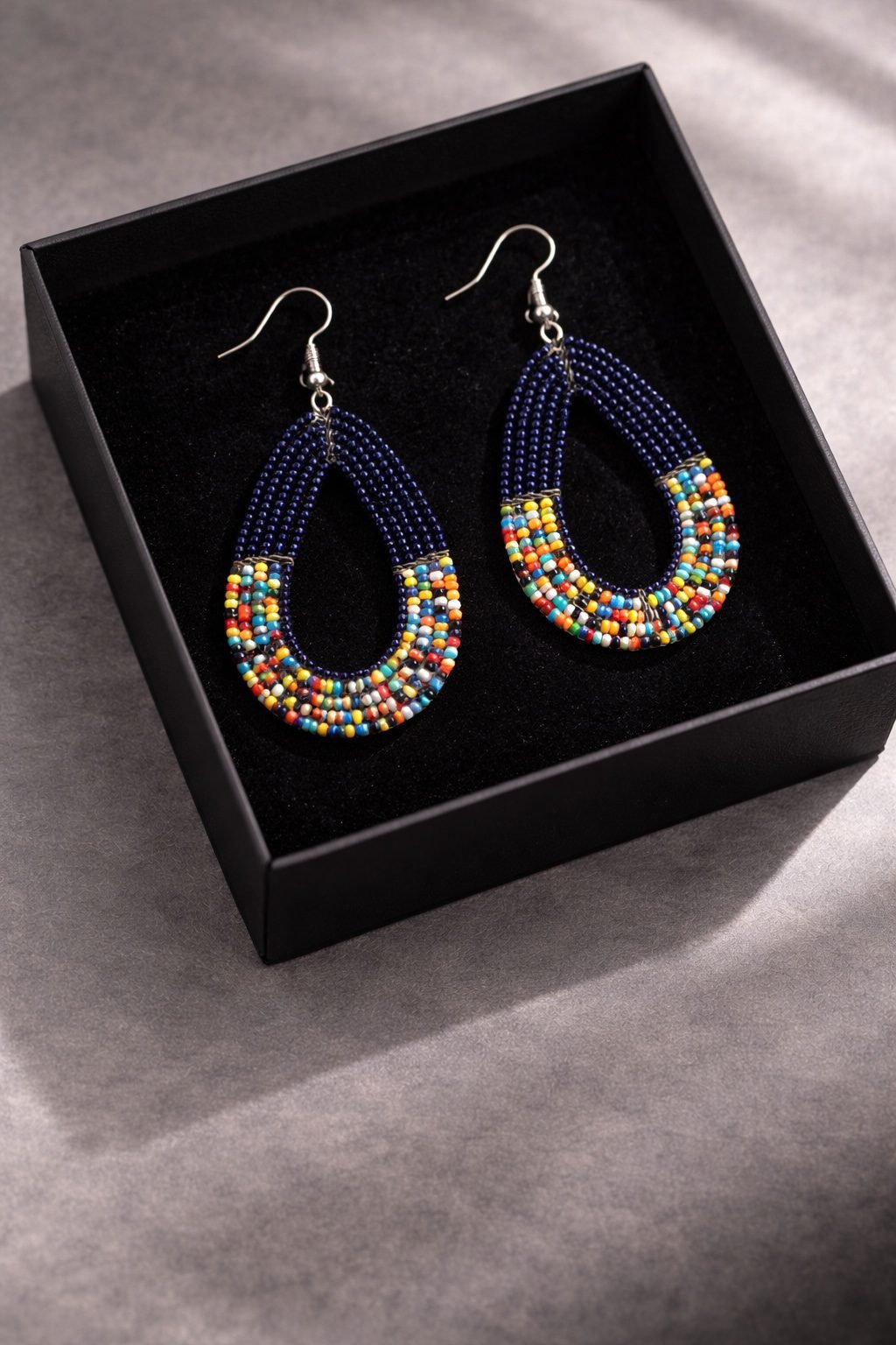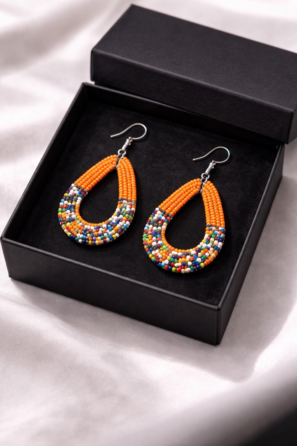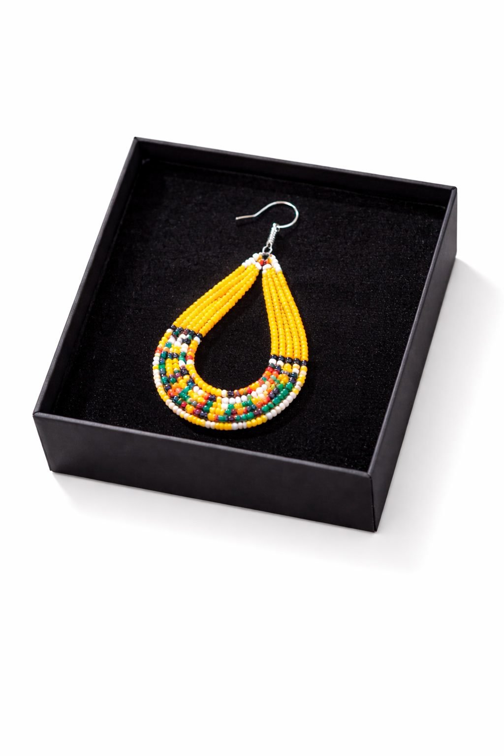These handmade African beaded teardrop earrings combine vibrant colour with a graceful, curved silhouette. The layered beadwork forms a smooth teardrop shape that feels both modern and timeless. As a result, the design stands out beautifully while remaining elegant and easy to wear.