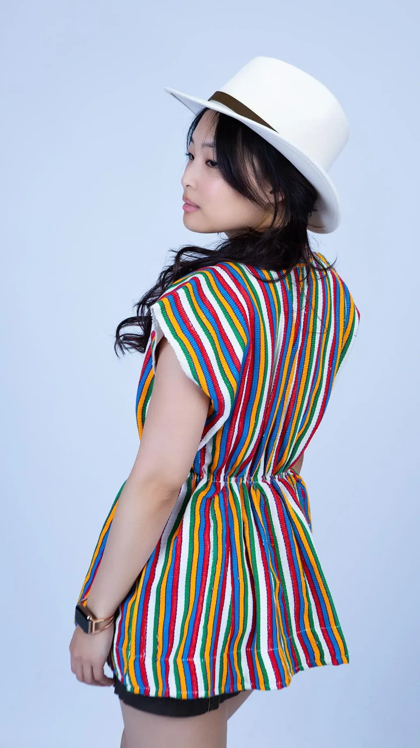 Purple Embroidery & Rainbow Stripes – intricate detailing for vibrant cultural expression