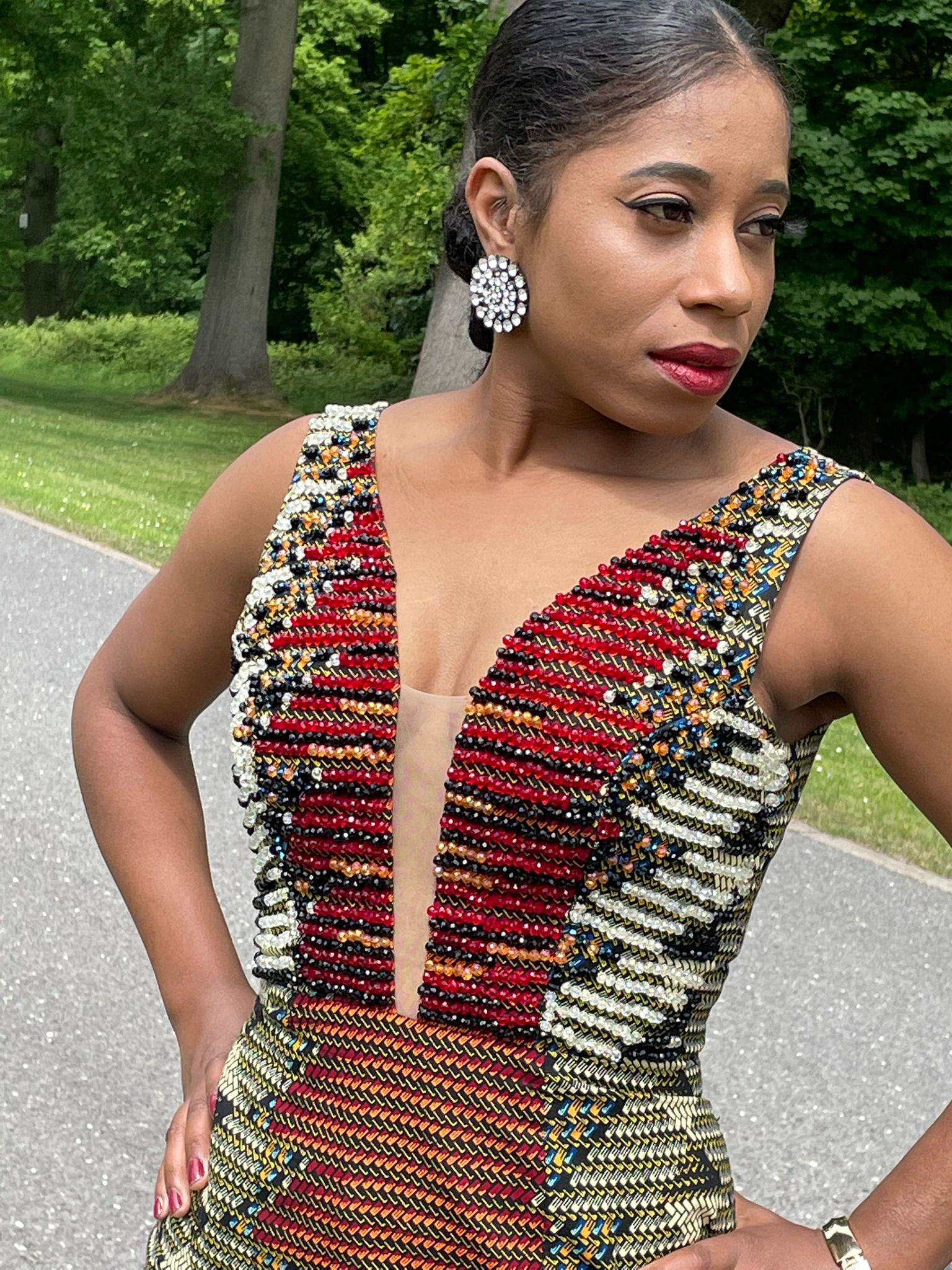 Introducing our stunning Jadore Beaded Elegant Bodycon Occassion. Featuring a beautiful beaded chest plate with sheer down the middle, against a beautiful Ankara fabric. This dress is a true statement of style and cultural heritage.