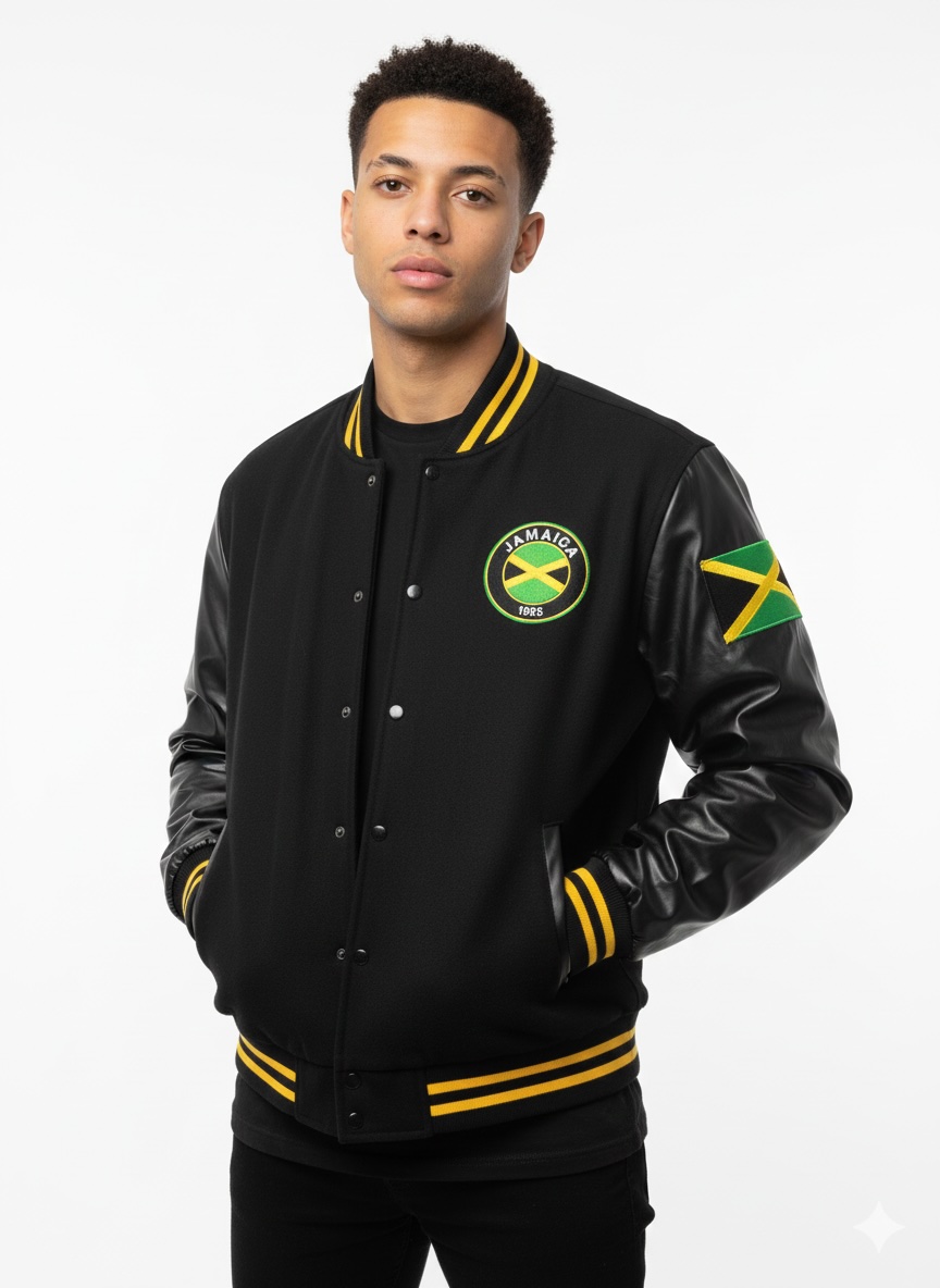 Bold unisex Jamaica varsity jacket with embroidered patches, soft lining, and classic snap front. Warm and perfect for everyday wear or cultural events.