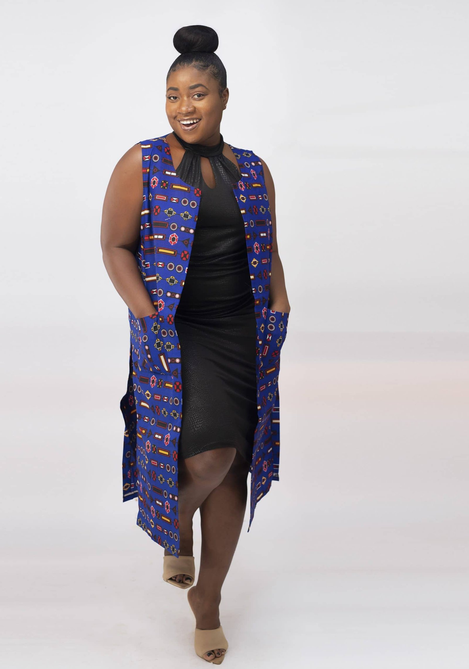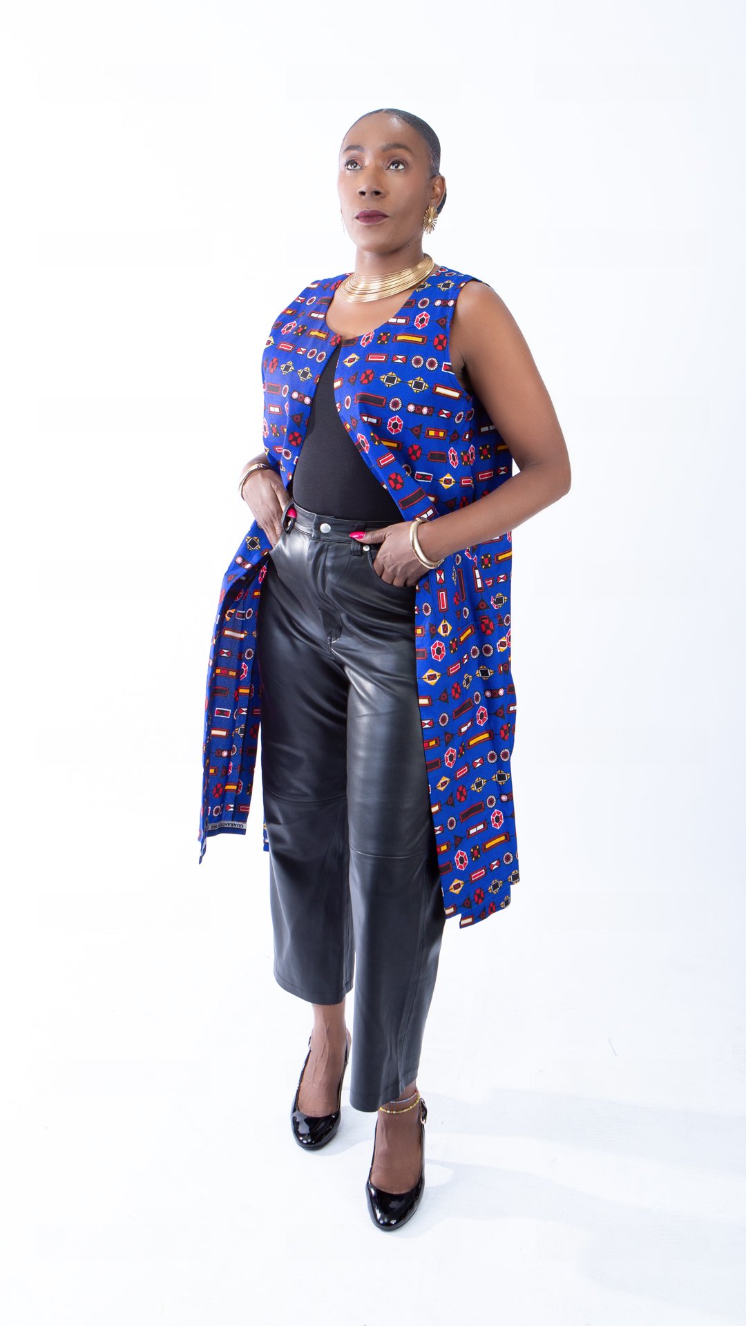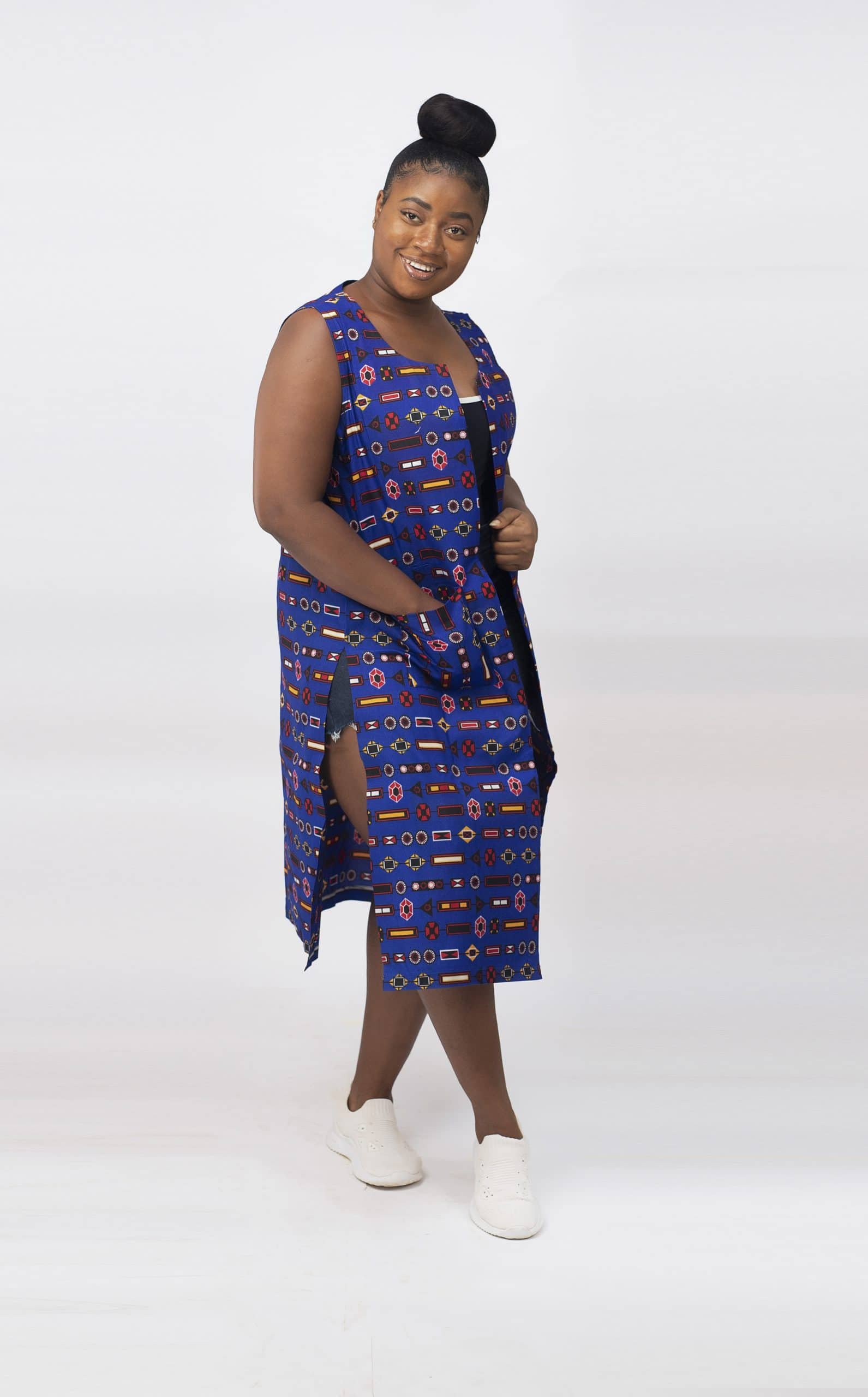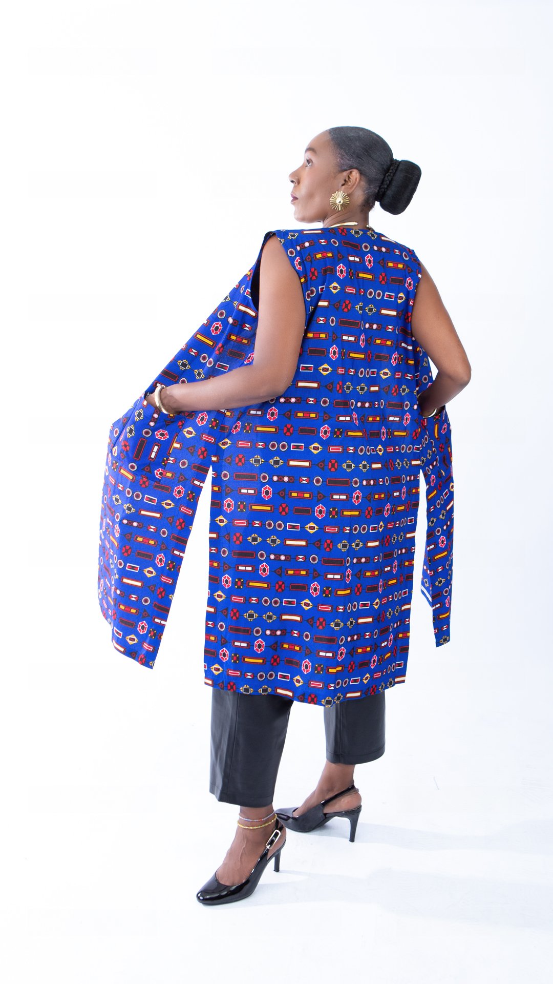 If you like African inspired designs like this Josie open front trench vest with African print then check out our Ladies Sleeveless coats.