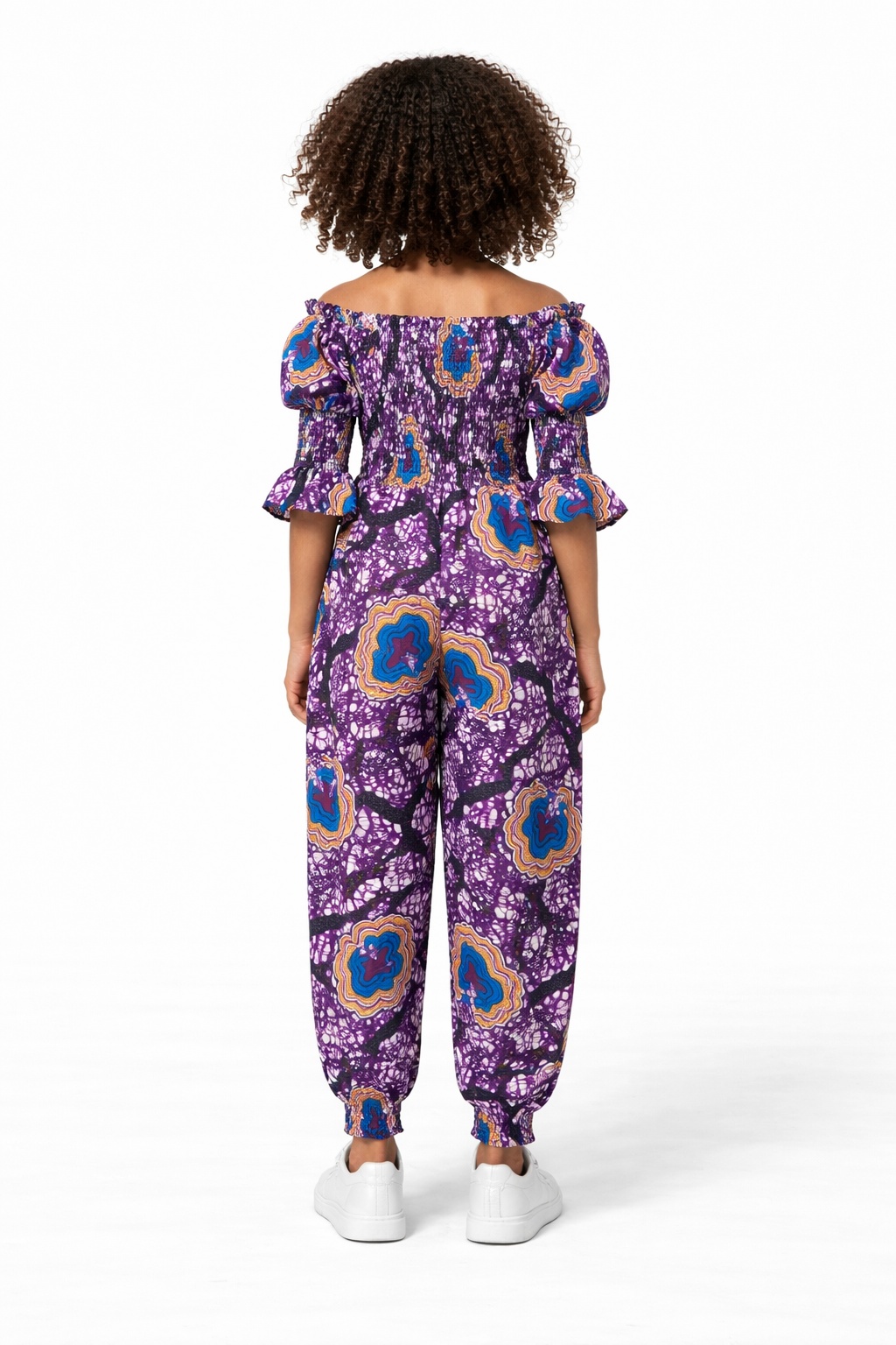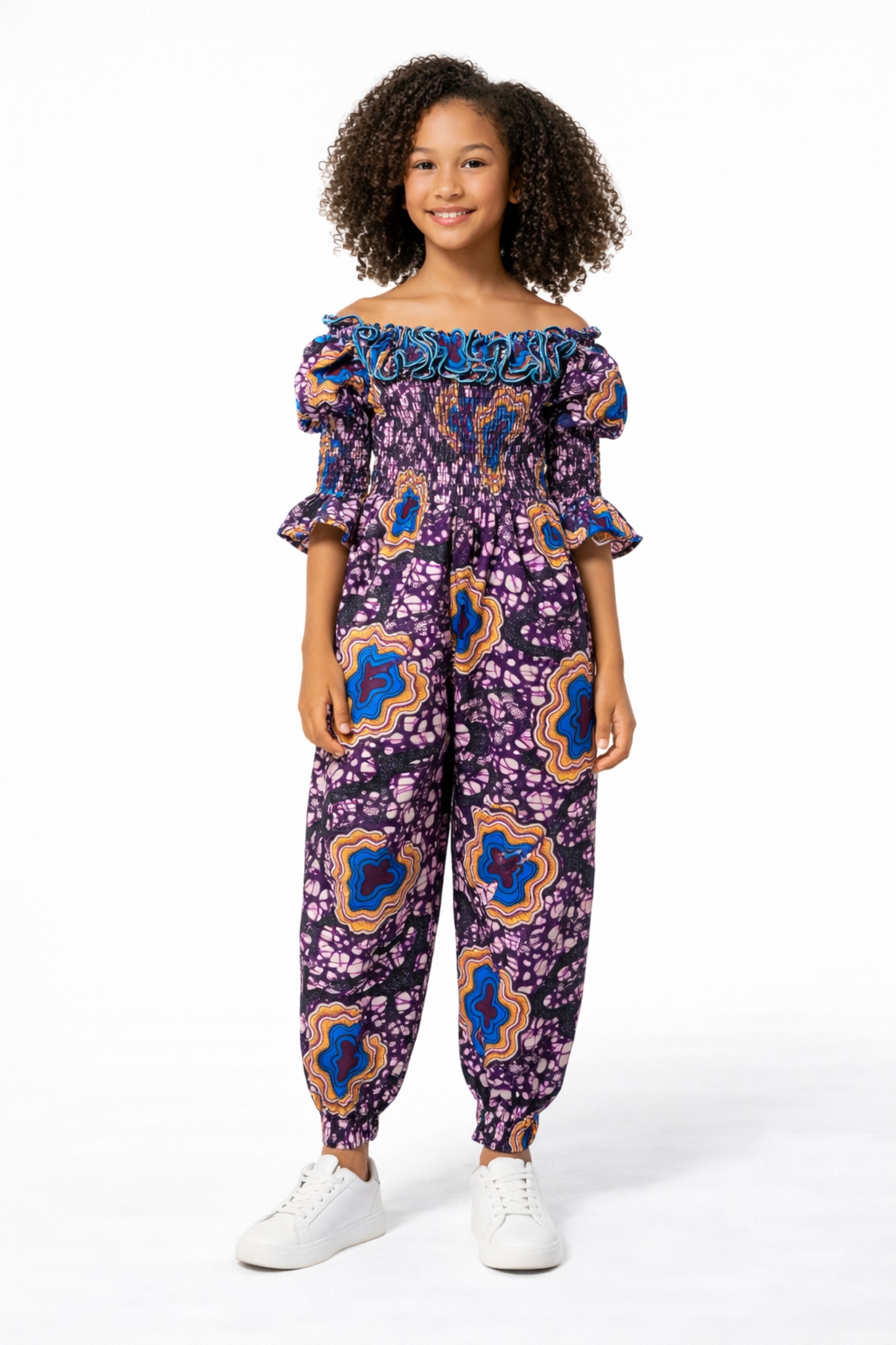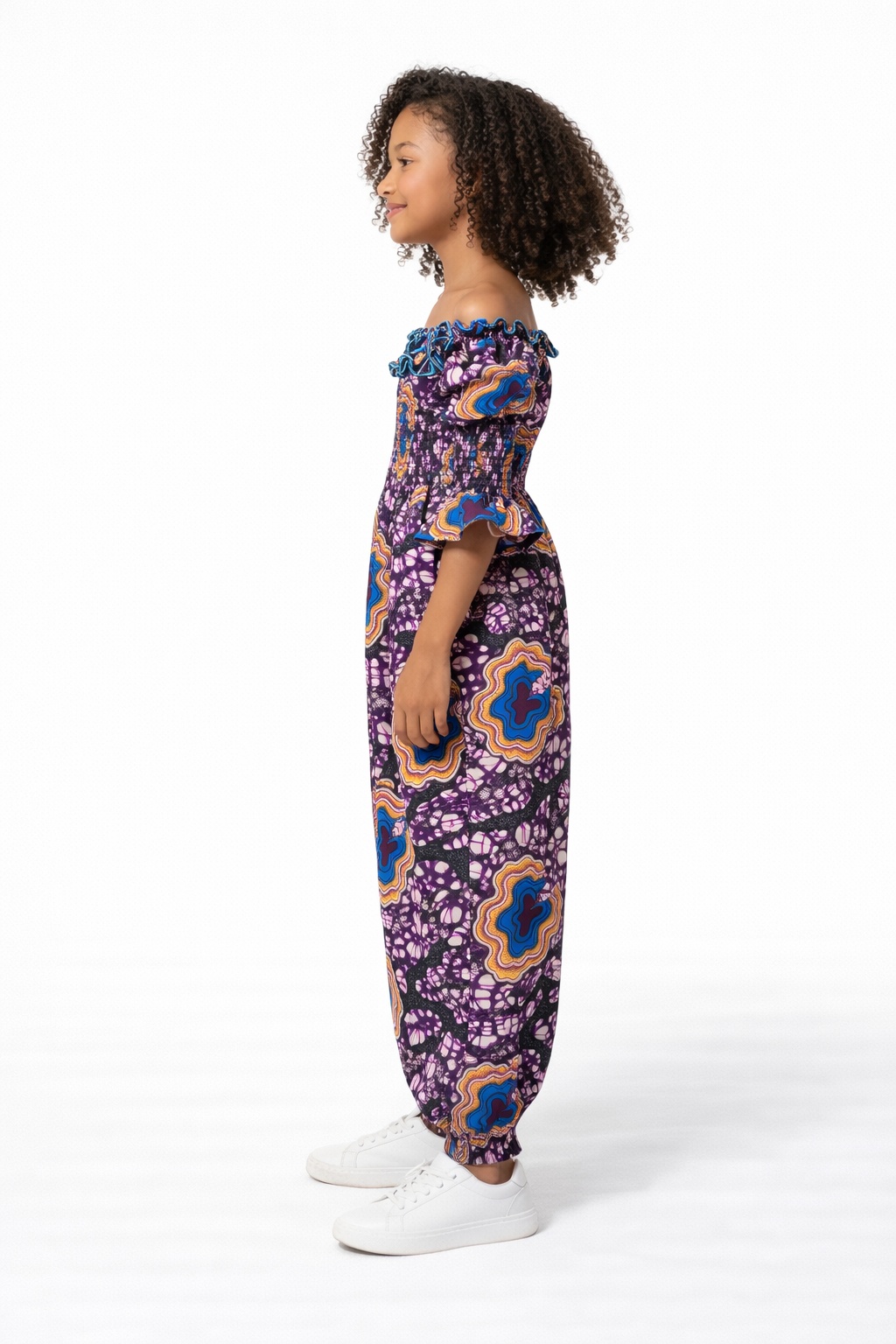 This Joyce African Ankara Print Kid’s Jumpsuit is a perfect addition to your child’s wardrobe. With beautiful colourful african print, it is unique and very comfortable for children as it has an elasticated waistline.