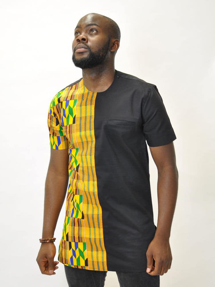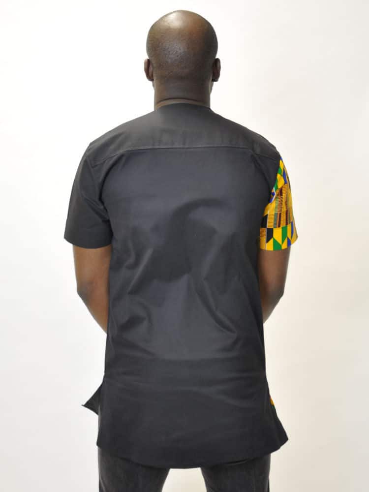 From our range of smart casual/business wear is this versatile black shirt made from polished cotton. This unique shirt is perfect with the half and half design.It’s perfect for when you need something appropriate for work that has a touch of African print!They are perfect for any smart casual event such as work or a relaxed top. Makes the perfect first piece of african clothing for the wardrobe!