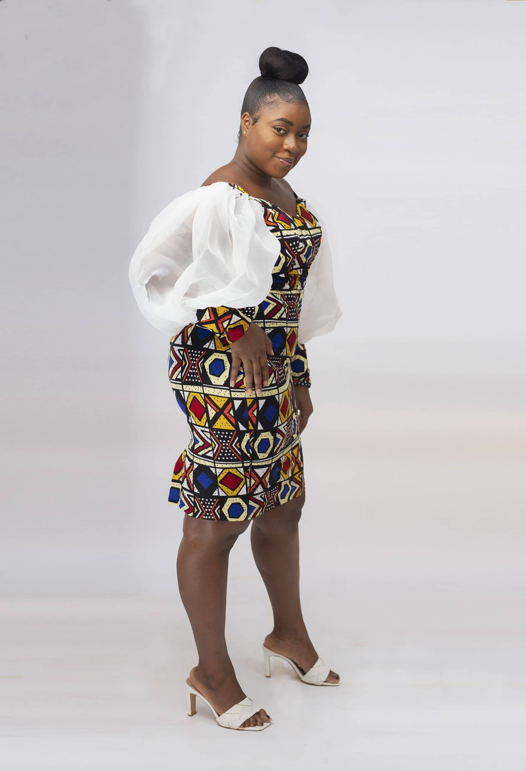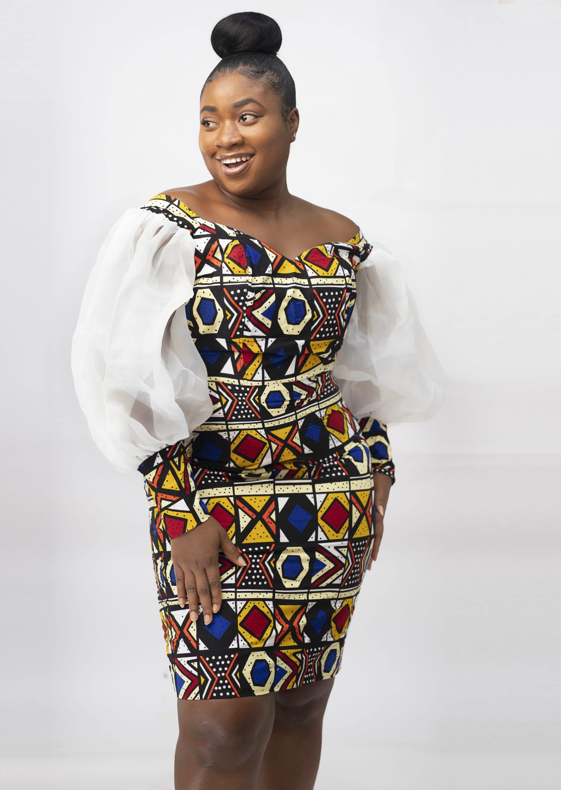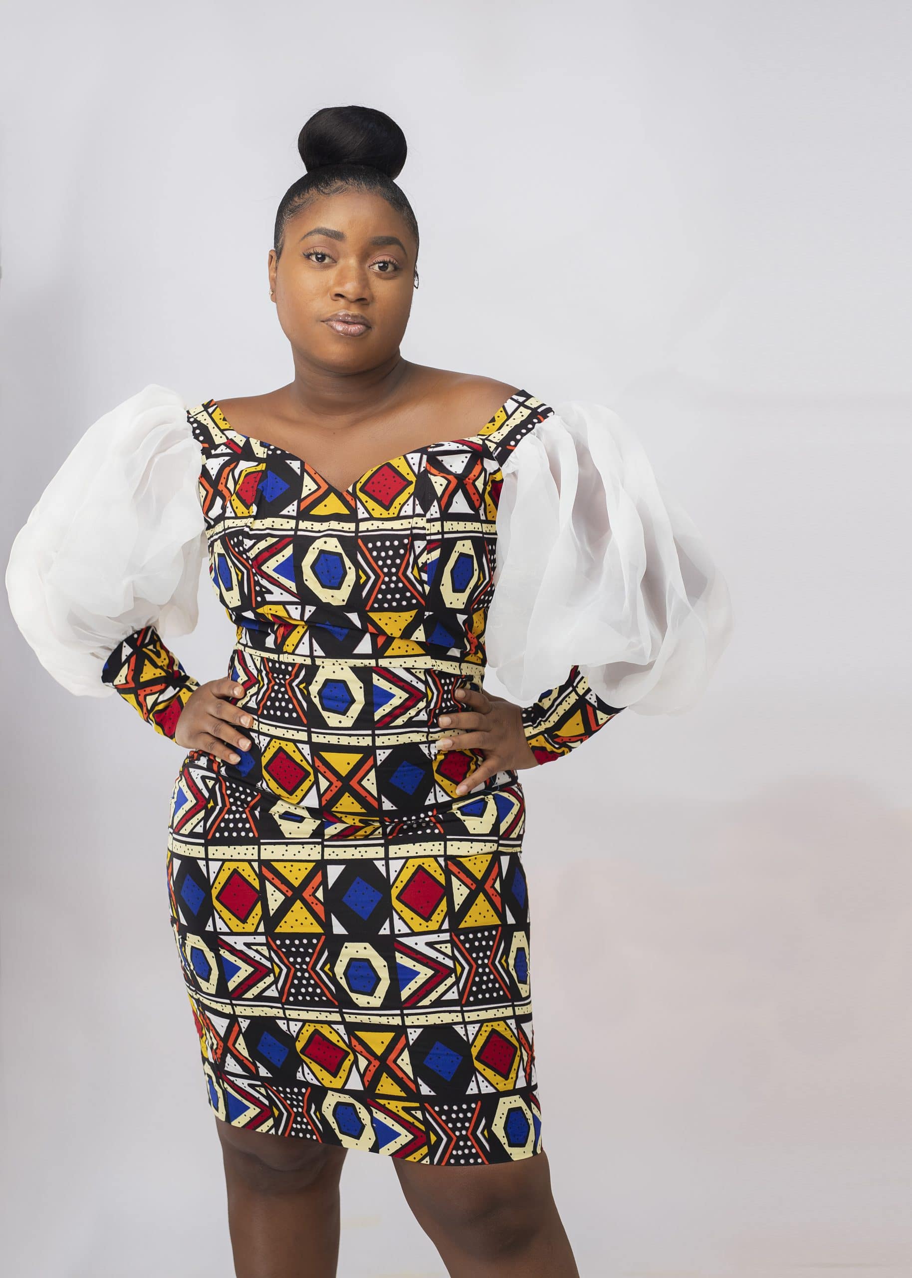 The Dress features a beautiful bodycon fit to enhance your figure, as well as having a suitable knee length style. Furthermore, the vibrant Ankara print, known for its rich colours and intricate patterns, creates a visually striking look that exudes confidence and individuality. In addition the dress features unique balloon sleeves and a sweetheart, off shoulder neckline, which create an elegant and unique look. Alongside this, neckline allows for accessories to be added.