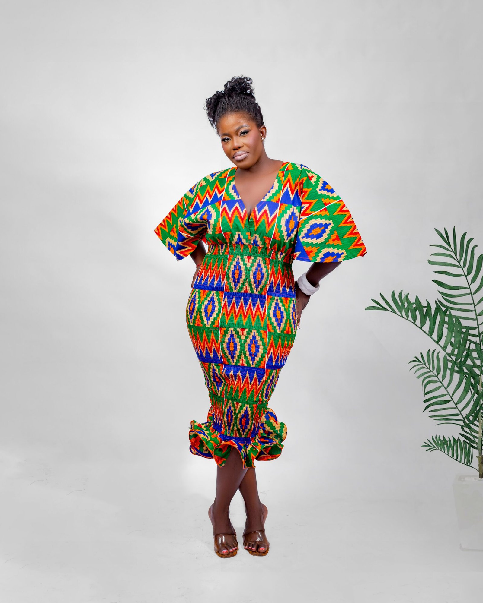 This eye-catching multicolored dress transitions easily from casual daywear to evening elegance. For instance, pair it with flat sandals and a sun hat for daytime fun, or switch to heels and statement earrings for a night out. Furthermore, the bold print makes it easy to style with minimal accessories — it speaks for itself.