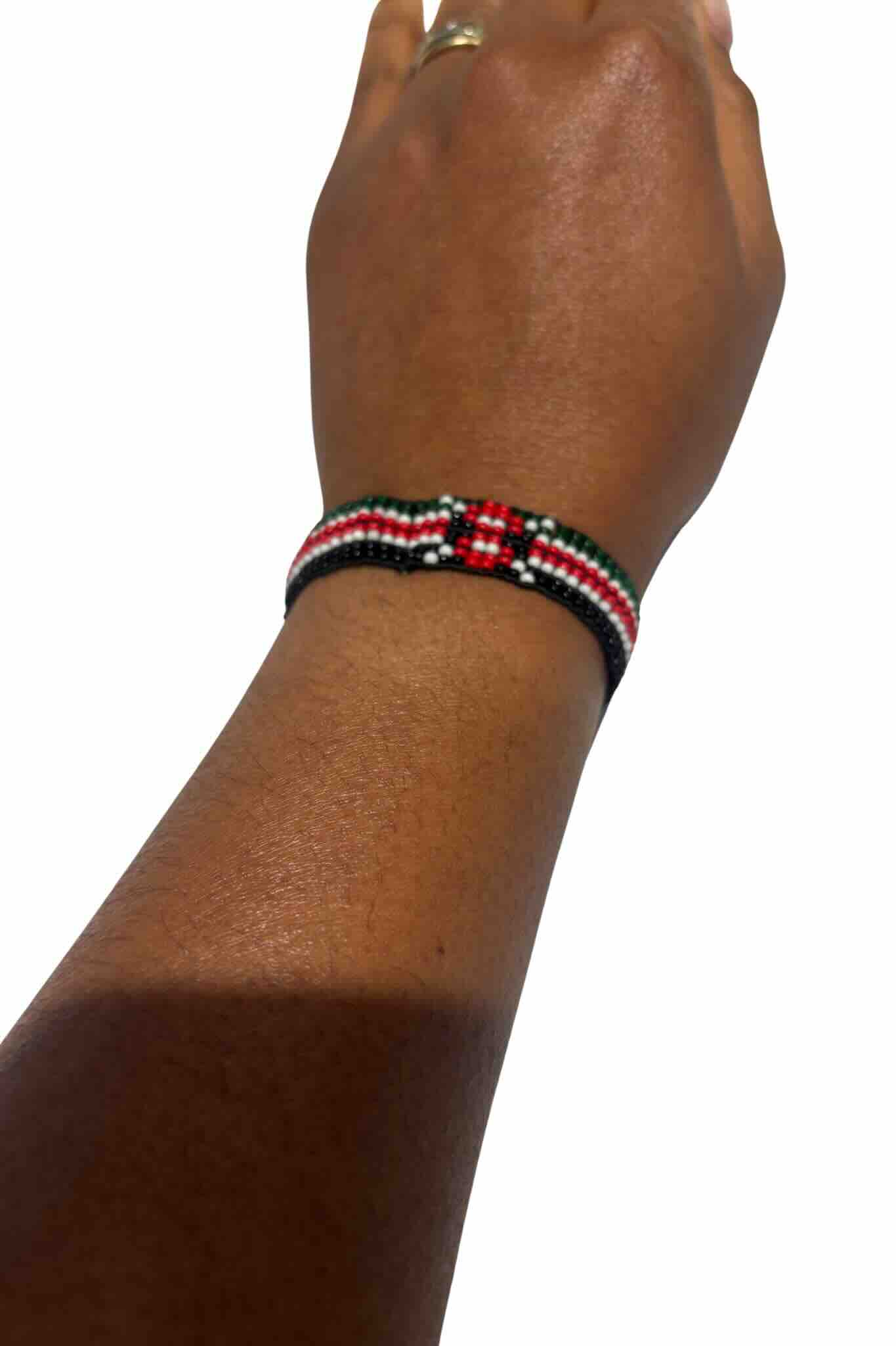Show your pride with this handmade Kenya Flag Beaded Bracelet. It carries the bold black, red, green, and white colors of the Kenyan flag. These shades symbolize strength, freedom, and unity. As a result, the bracelet is more than jewelry—it is a meaningful statement of heritage.