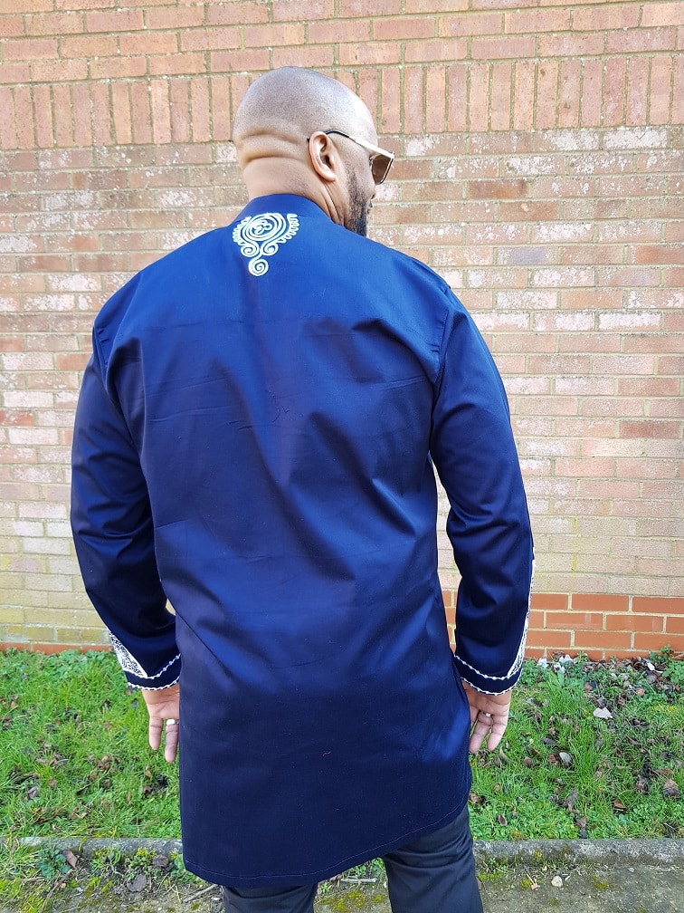 Looking for an embroidery shirt that’s smart as well as having a neat royal look then this Kgosi Navy & Abstract White Embroidery Shirt is the shirt for you. It features navy blue polished cotton with abstract white embroidery on the front the sleeves and at the back.It also features a Chinese neck collar with a button which helps set a royal formal look. It also has a slight opening at the front.Its suitable for any formal occasion or any occasion of your choice. You are sure to be the best dressed at any occasion!