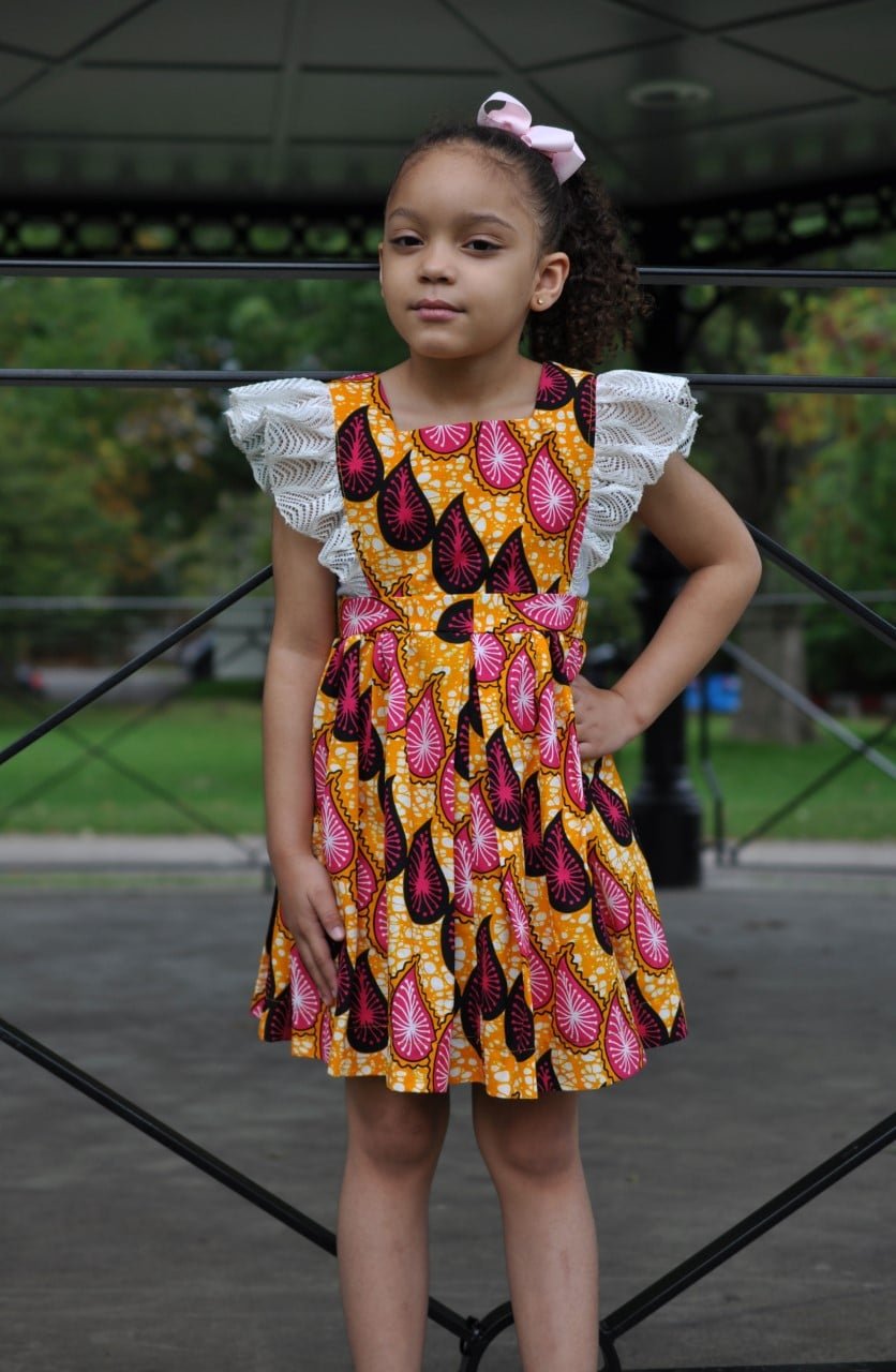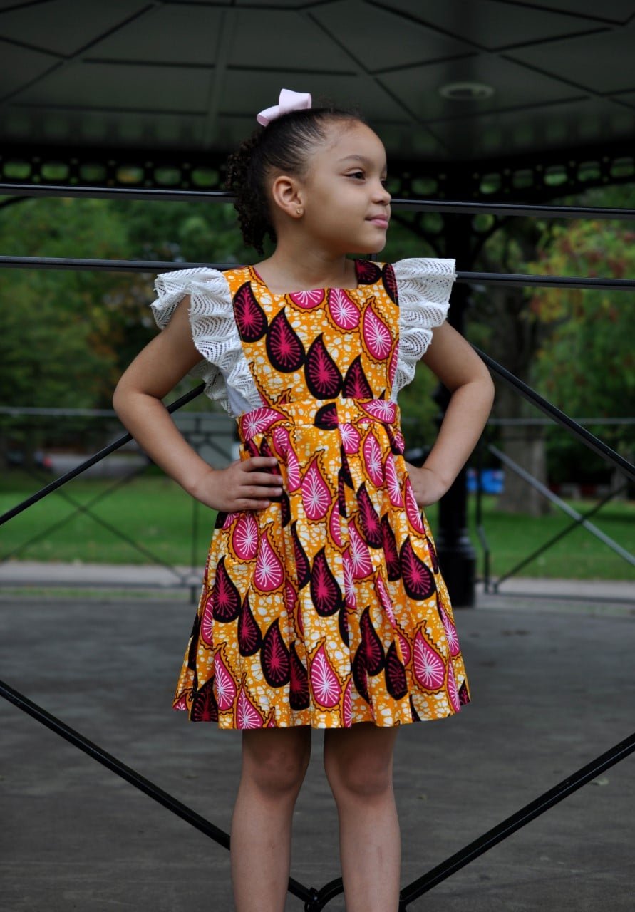 This beautiful Kids African Print Amina Lace Occasion Dress  for children with pretty, multi-coloured African / Ankara teardrop print is perfect for spring & summer! The unique, lace ruffle at the shoulder adds a touch of elegance and this dress can be paired with matching hair clips / bows and some sandals to really finish the look!