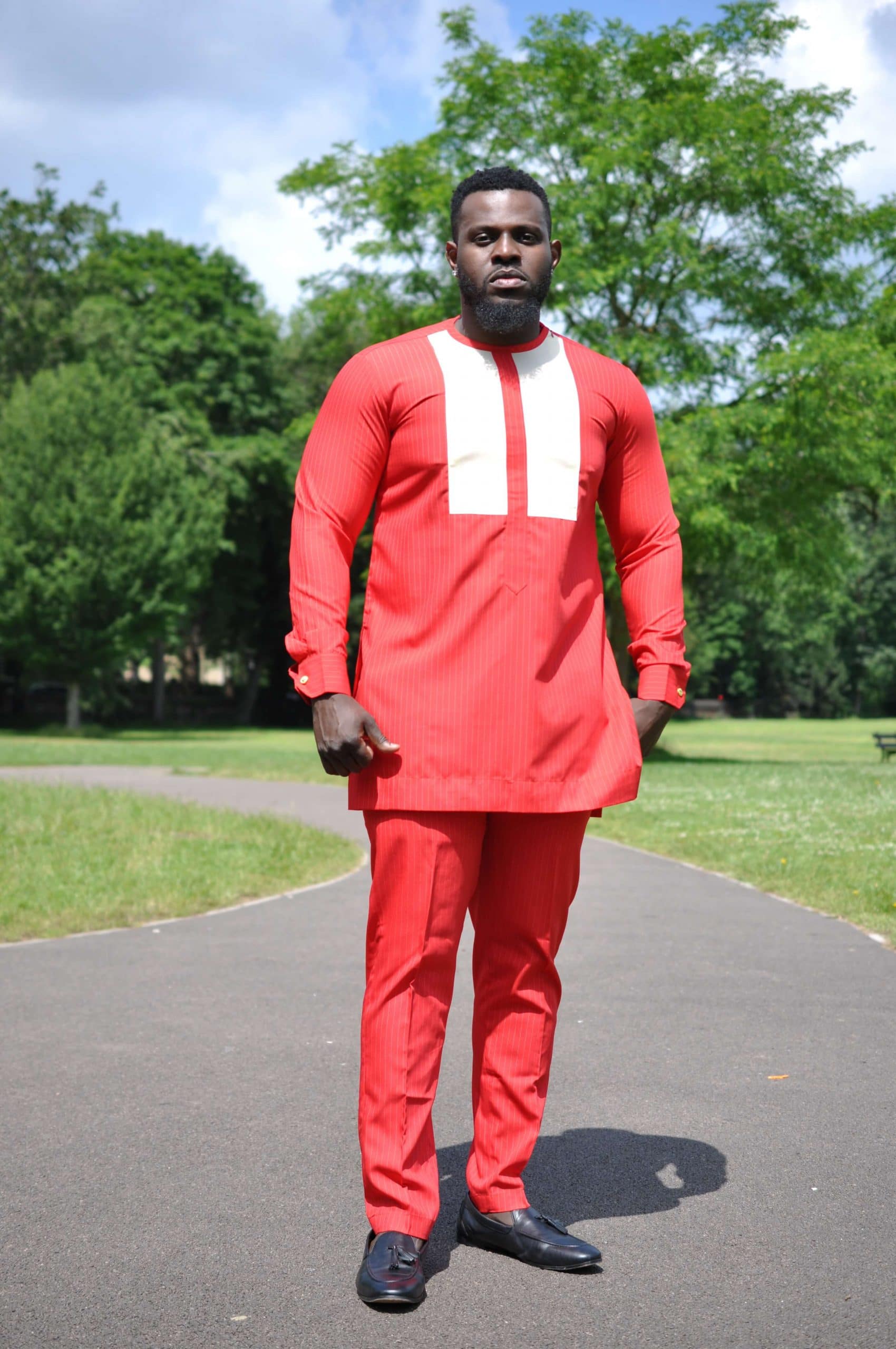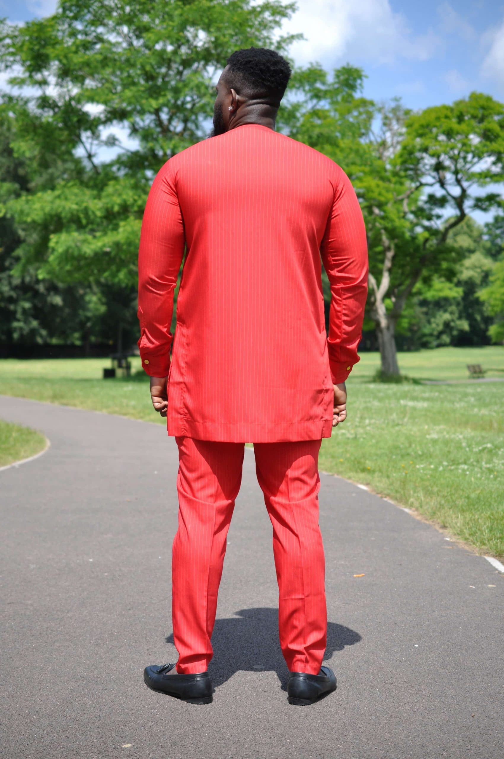 Looking for a suit that fits your perfectly, with beautiful African embroidery? Then this custom made Kwabena Red African Men’s Suit is the suit for you! An African-inspired design with a modern European twist, this suit is perfect for any occasion such as weddings, engagement parties and other similar outings. Buy the two piece set (includes the shirt and trousers) or buy the top or pants separately. Worldwide Shipping is available. Free UK Shipping!