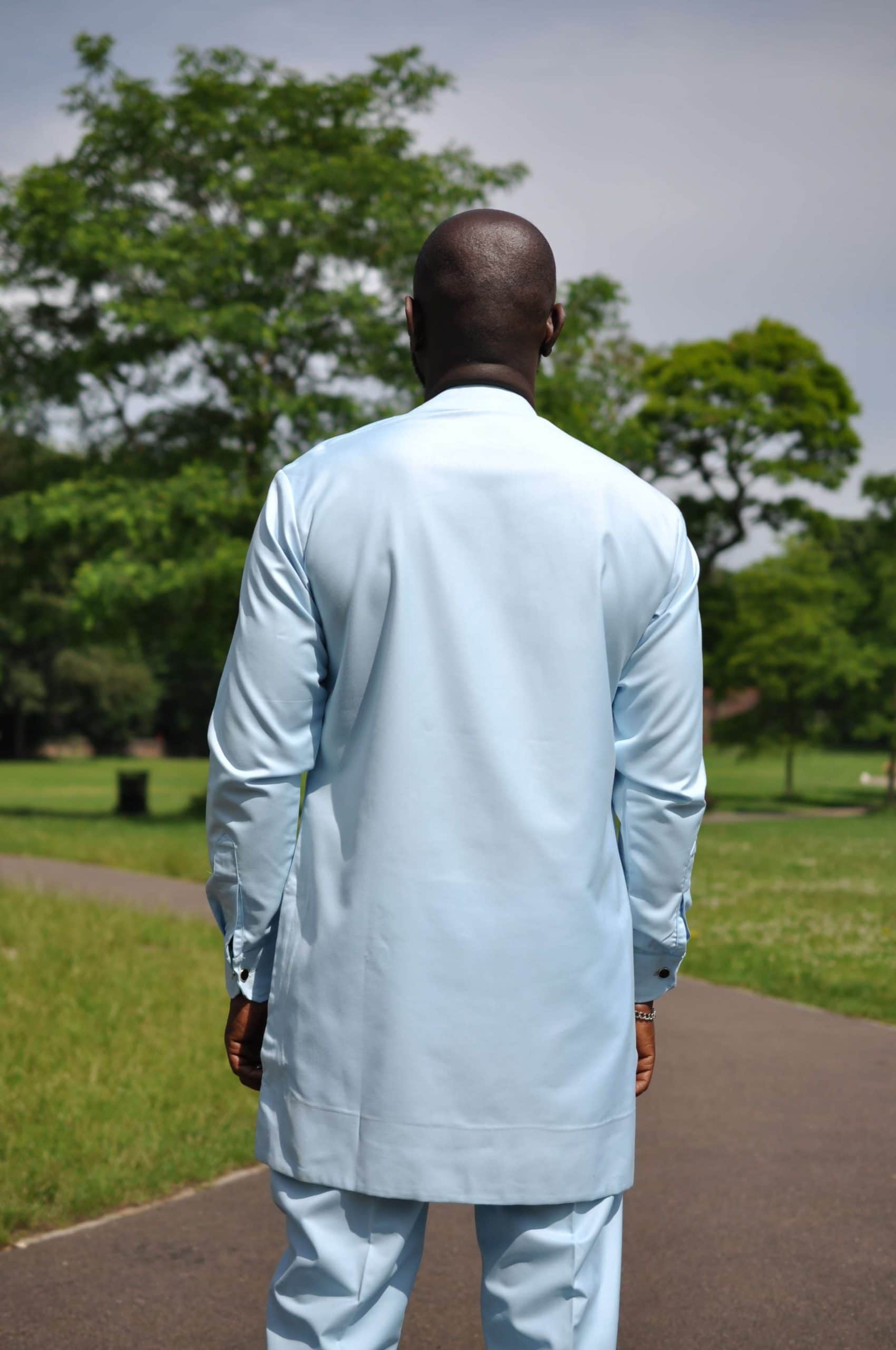 Looking for a unique suit?  Then this Kwadzo light blue African Men’s Suit with dark blue and white detail is the suit for you! An African-inspired suit design with a modern European twist, this suit is perfect for any occasion such as weddings, engagement parties and other similar outings. Buy the two piece set (includes the shirt and trousers) or buy the top or pants separately.  Worldwide Shipping is available. Free UK Shipping!