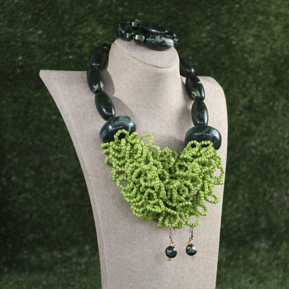 This Green Acrylic Beaded Necklace can compliment any outfit by adding It onto any plain top or compliments the beautiful colours.You can dress it up by putting it onto of a plain dress with heels to give that elegant look. It can also be partnered up with some of the beautiful earrings we have available.