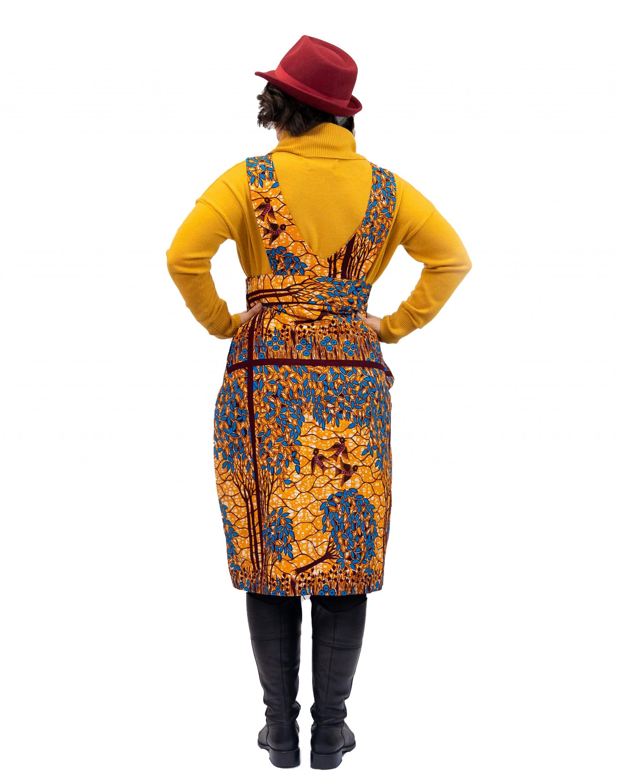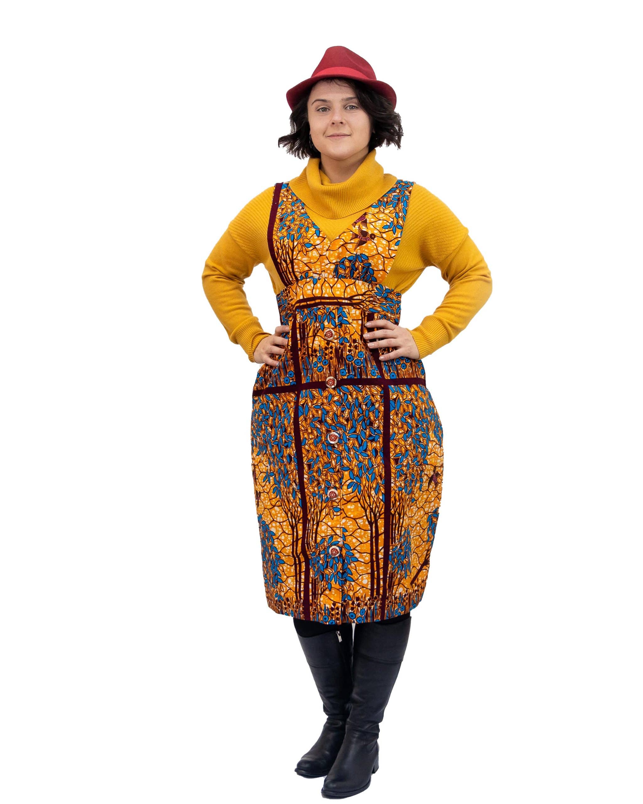 This Lucia African Floral Print Pinafore V-neck Dress is great for every day wear. In addition, it can easily be partnered with a long sleeve top or jumper/turtleneck , it can be styled up or down to be suitable for every season of the year.