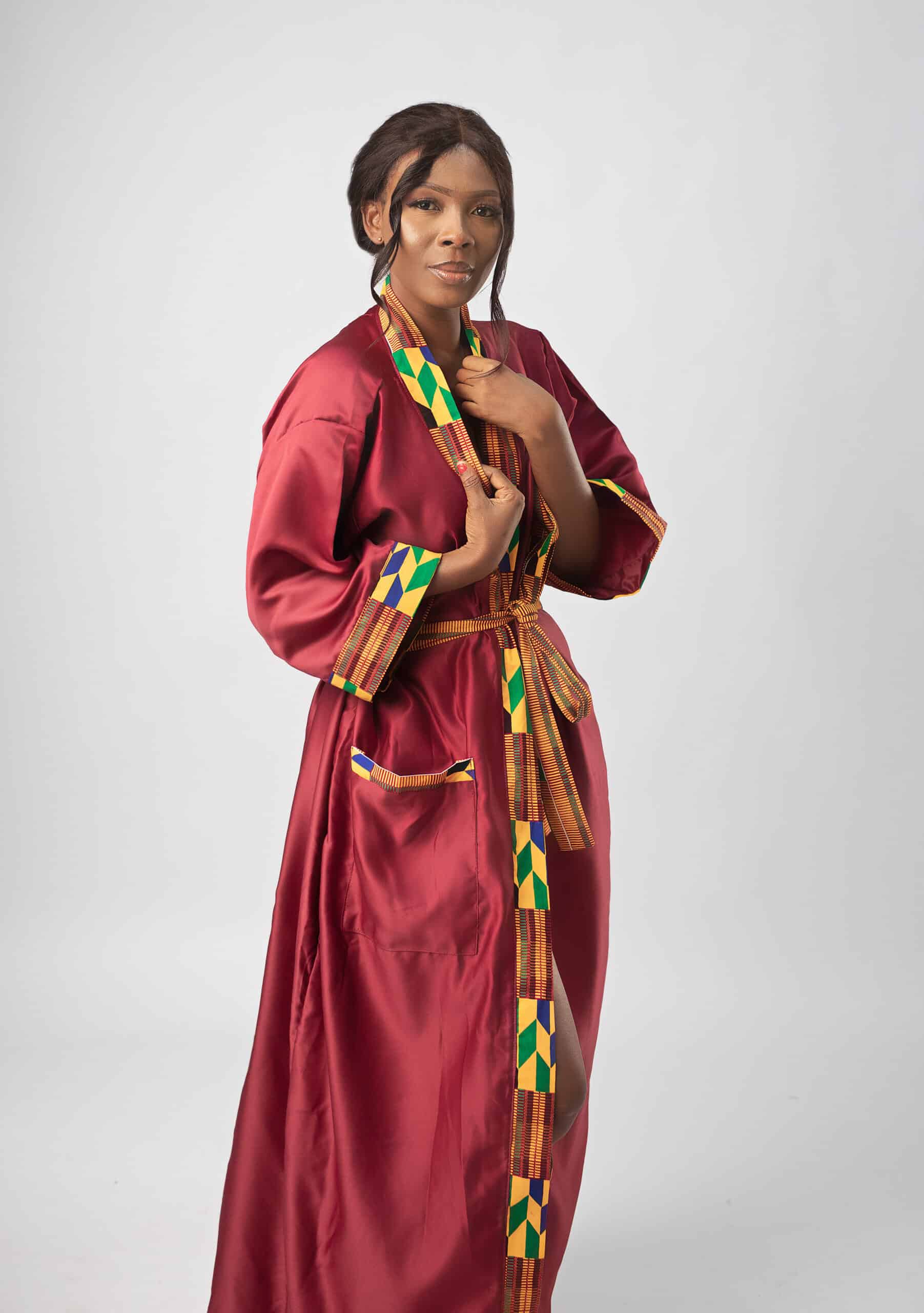 The first thing you’ll notice is the vibrant and mesmerising African Kente print that adorns this robe. It features a captivating array of colours and patterns that pay homage to the rich traditions and heritage of Africa.