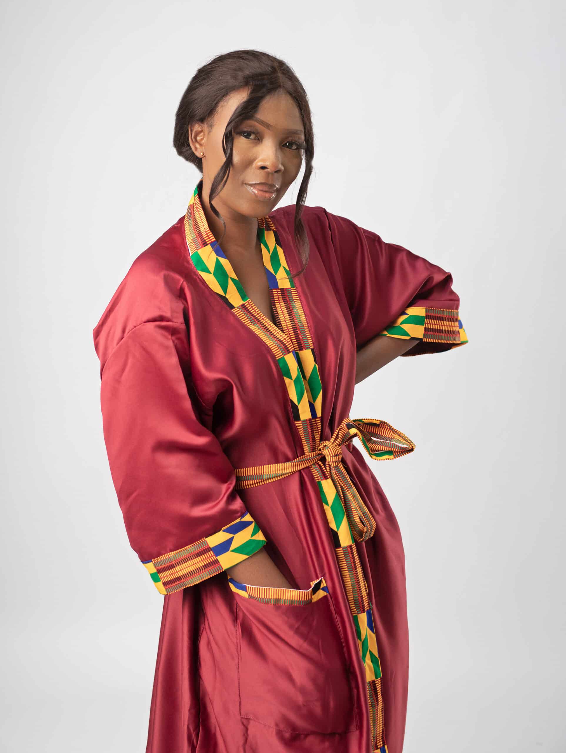 Introducing our stunning Maroon & African Kente Print Satin Kimono Robe, the epitome of comfort and elegance. This exquisite robe seamlessly blends luxurious comfort with a touch of cultural beauty. Crafted from a silky, soft satin material, it exudes an unmatched sense of opulence, making it the perfect addition to your loungewear collection.