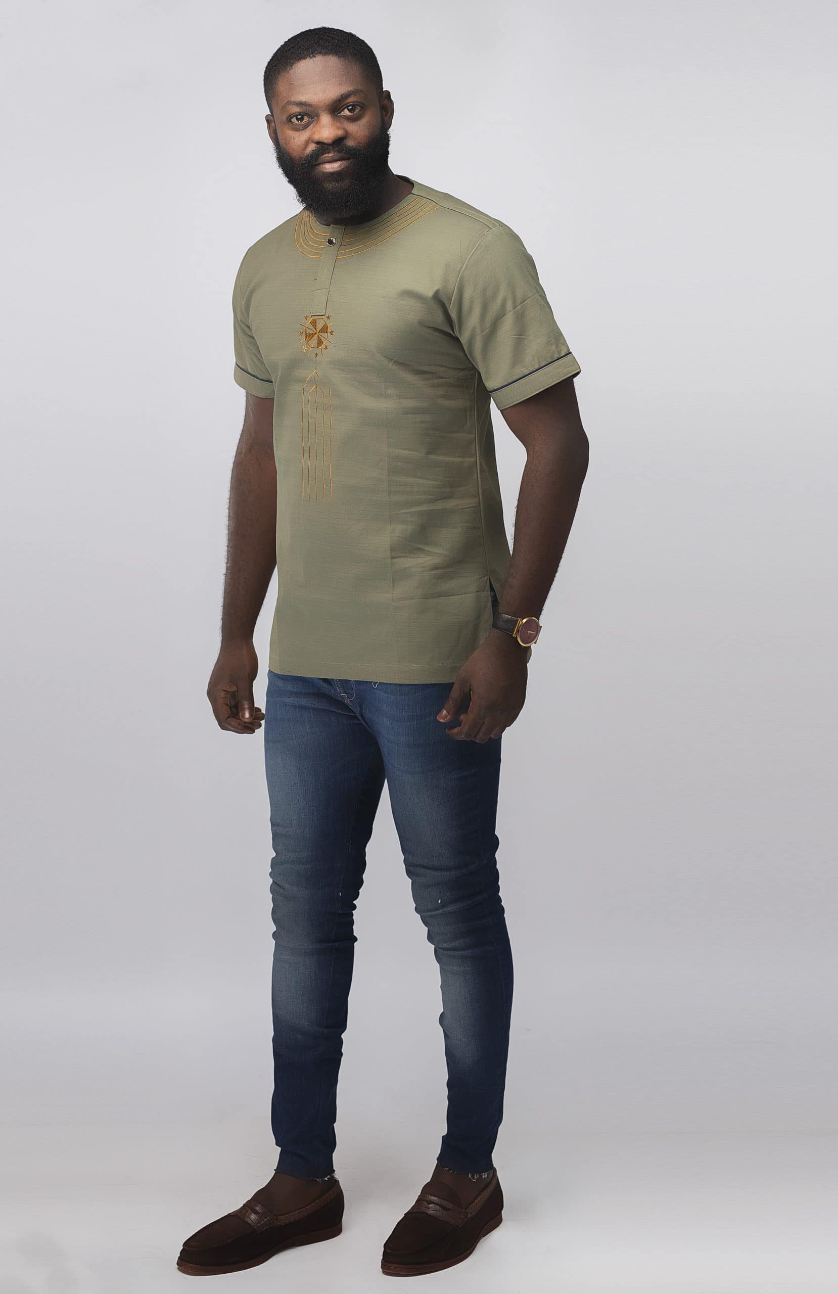 Looking for a smart embroidery shirt that is also affordable? Then this Momar Slim Fit Embroidered African Shirt is  perfect.  This khaki cotton shirt features an abstract minimalistic gold embroidery pattern around the neckline, down the chest and also black embroidery around the sleeves to give you a magnificent look. It also has a slim fit design so it fit snugly to the body.  The added bonus is that we can custom make this shirt to fit you perfectly!  Just give us your measurements with your order (please see below for details).