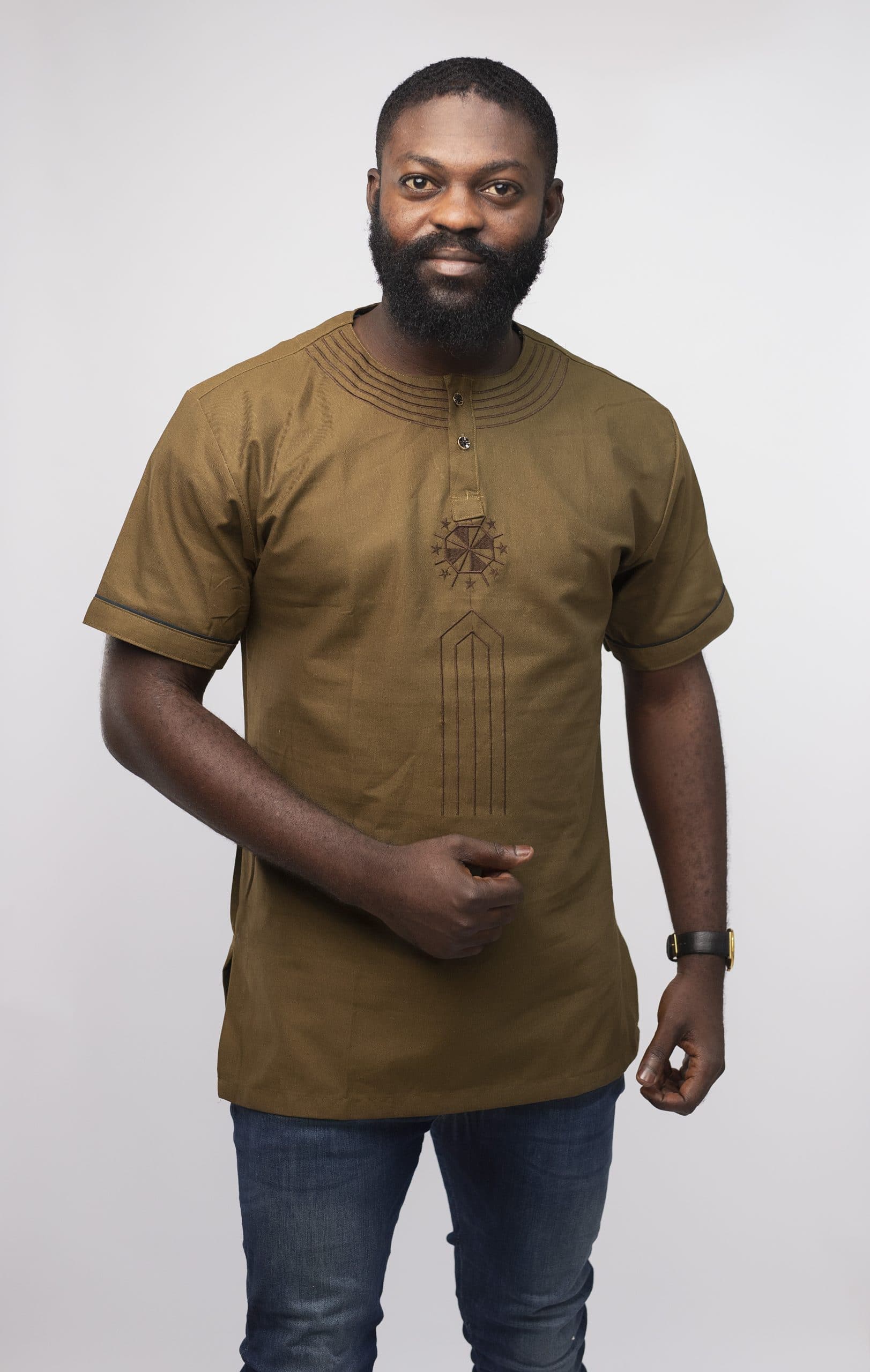 Looking for a premium quality embroidery shirt that is also affordable? Then this Morathi Slim Fit Embroidered African Shirt is perfect. This brown shirt features embroidery across the front and sleeves for a touch of elegance. With a slim fit design, this shirt fits snugly to the body for a fitted look.