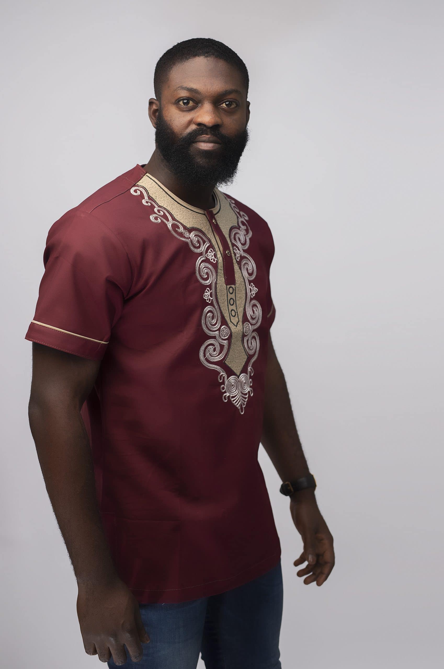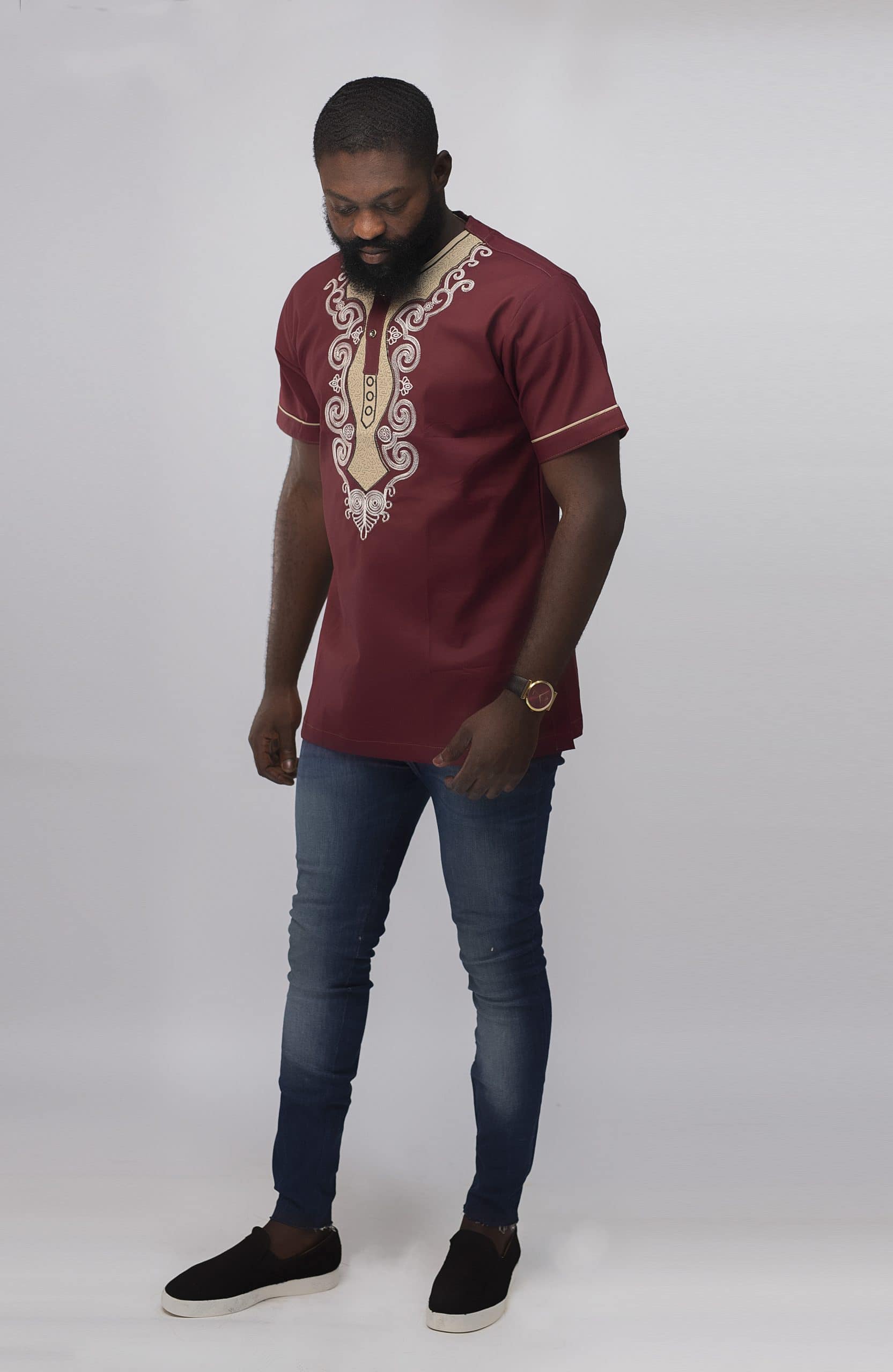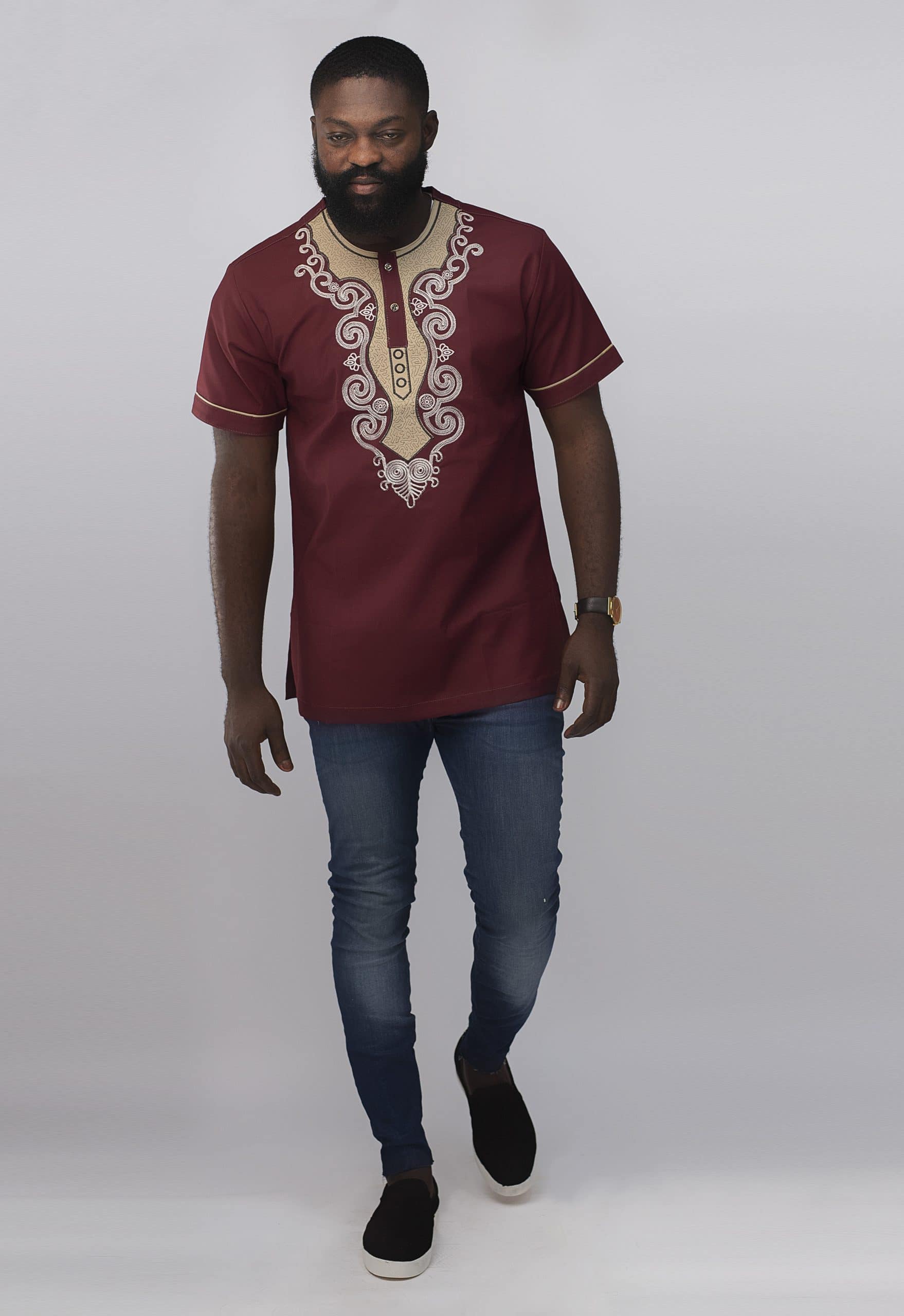 Looking for a smart embroidery shirt that is also affordable? Then this Muenda Slim Fit Embroidered African Shirt is perfect. This burgundy / wine cotton shirt features elaborate cream / light pink embroidery around the neckline, chest and sleeves for that wow factor. With a slim fit design, this shirt fits snugly to your body. The added bonus is that we can custom make this shirt to fit you perfectly! Just give us your measurements with your order (please see below for details).