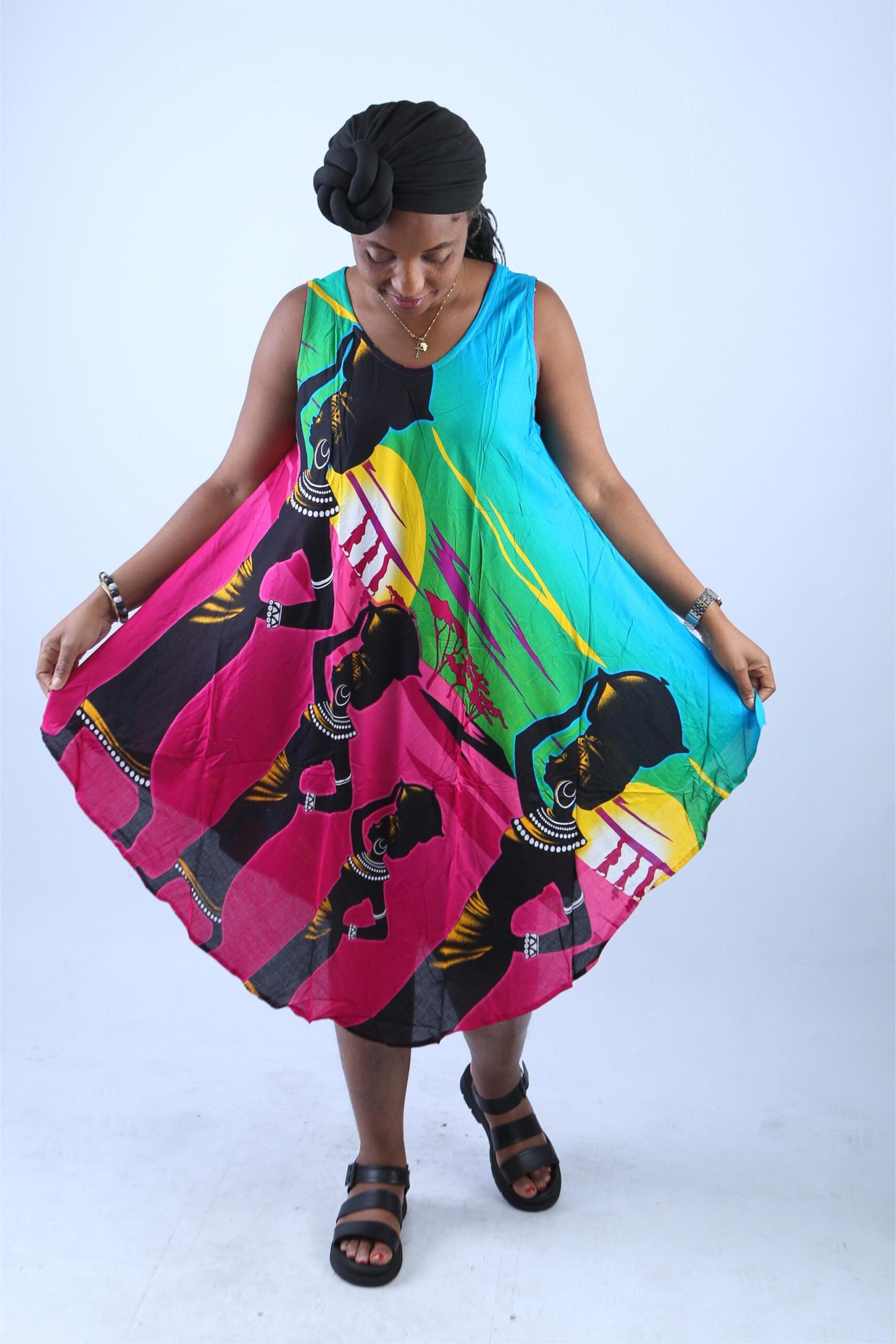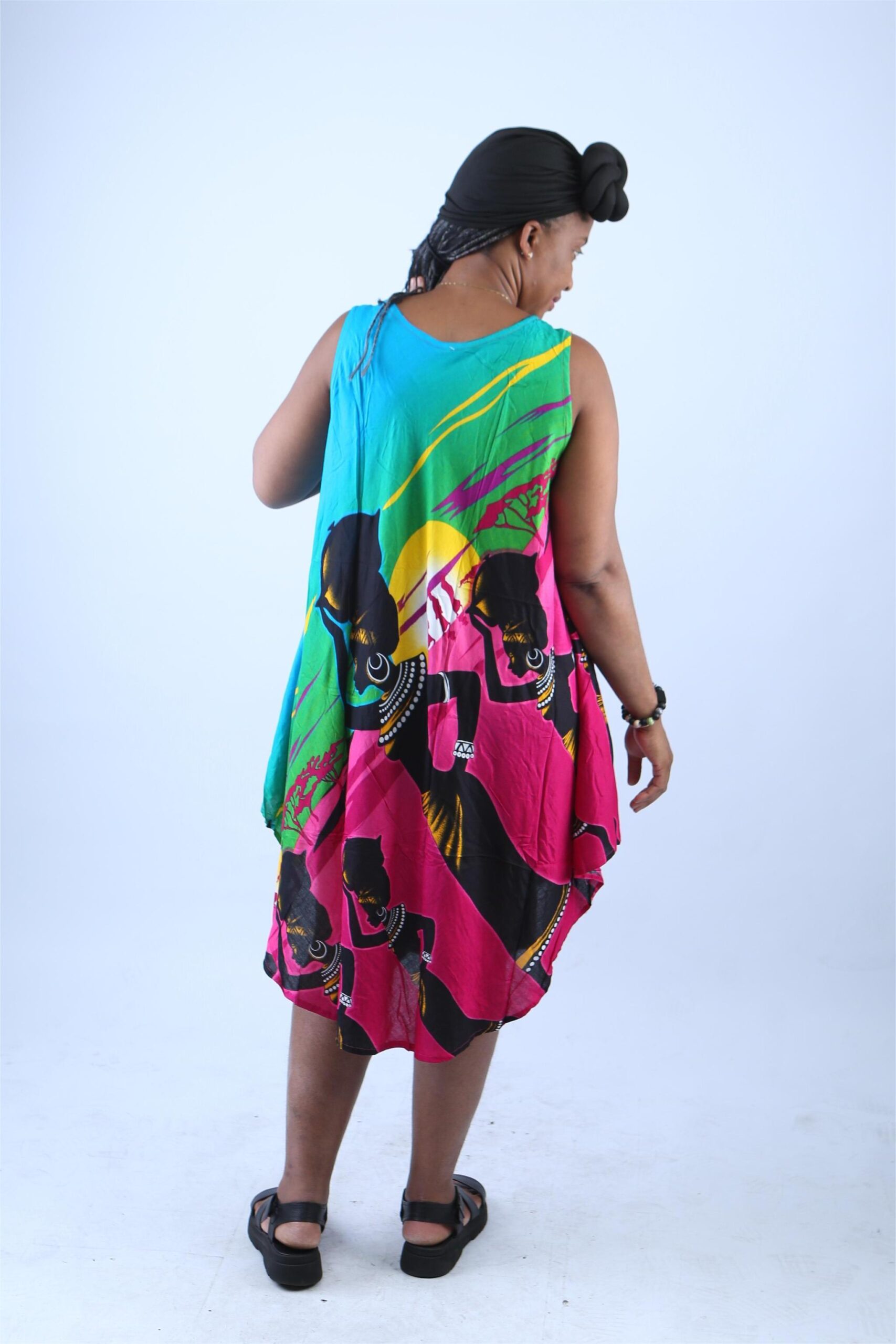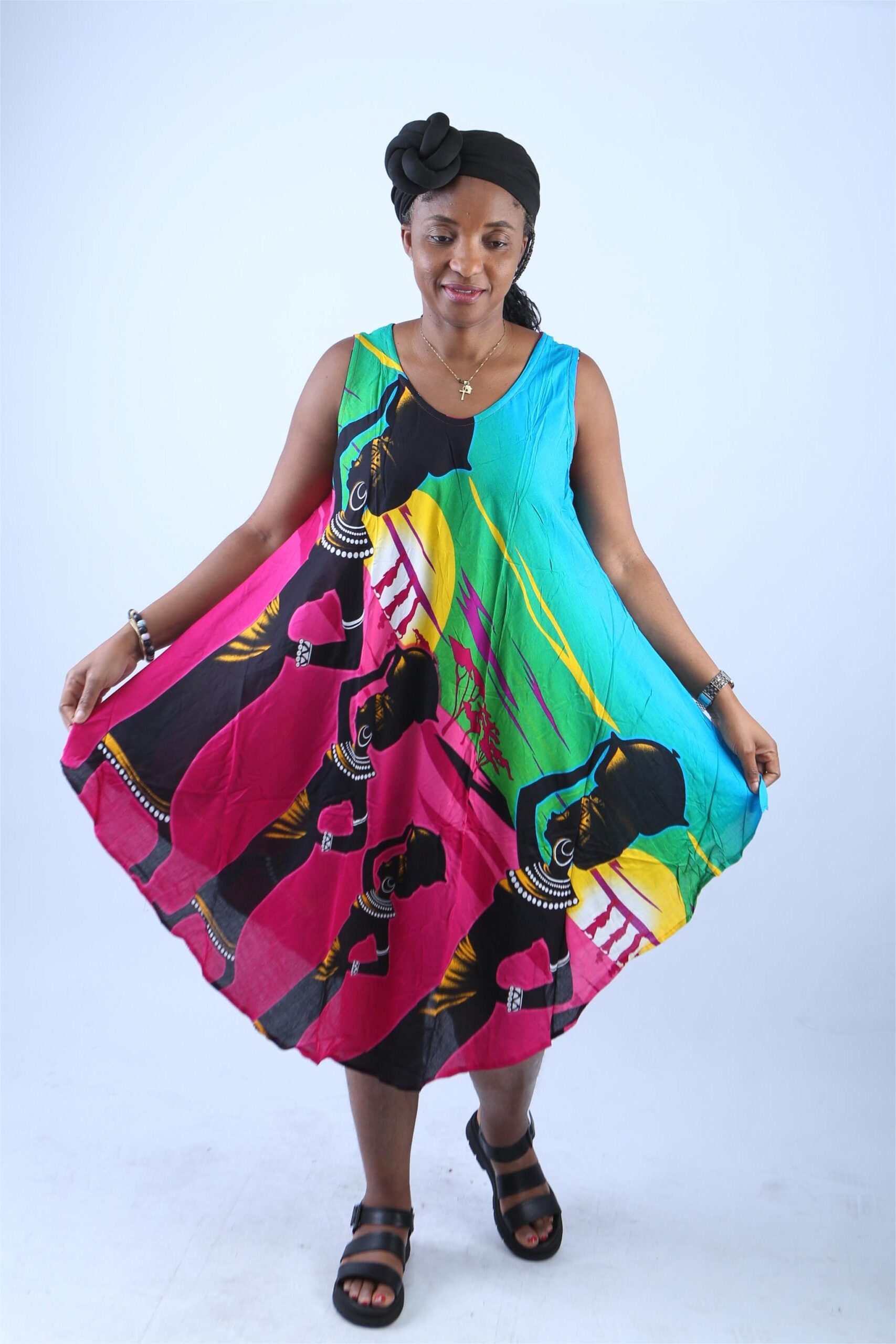 To start with, the dress features a captivating display of tribal women in traditional attire, masterfully printed across a swirling canvas of vivid hues—turquoise blue, fuchsia pink, deep green, bright yellow, and classic black. These bold tones aren’t just eye-catching—they’re soul-stirring, representing joy, energy, and heritage. The elegant profiles of the women, adorned with beaded necklaces and headwraps, add a sense of grace and storytelling, turning this garment into wearable art.