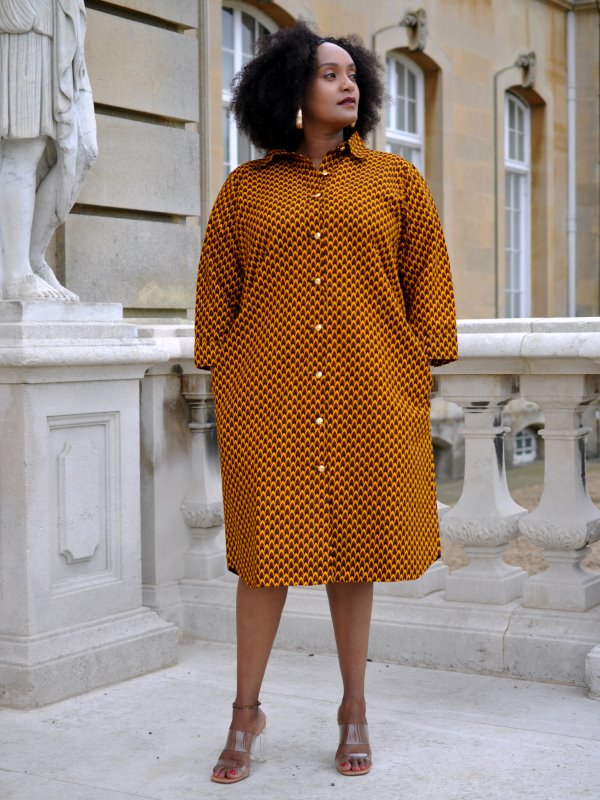 For this season’s wardrobe is this lovely mustard-yellow African print shirt dress. Ideal for a casual stroll or everyday wear. Pair with heels for a more elegant look Purchase this custom made African print dress as displayed or customise it with your own design! Change the length, neckline or choose a different fabric!