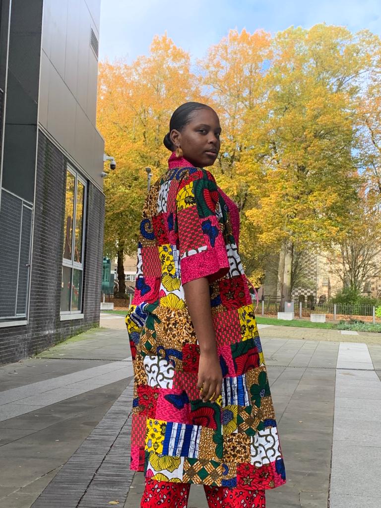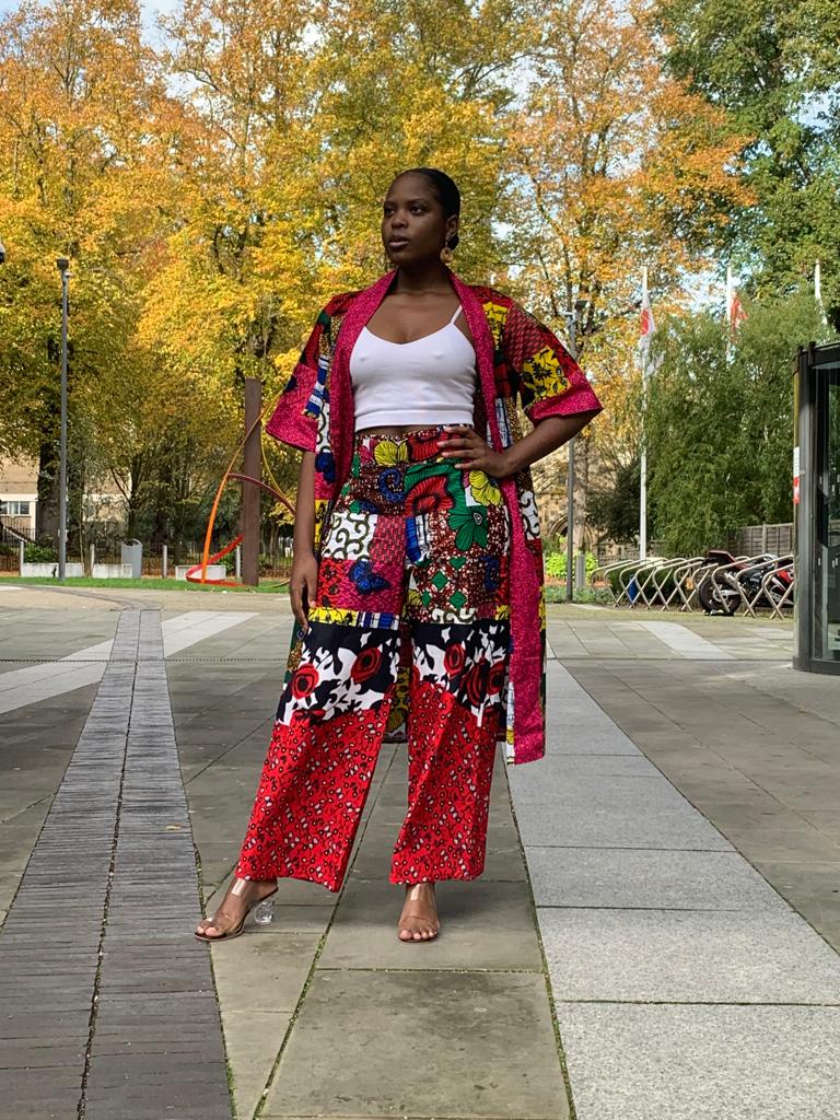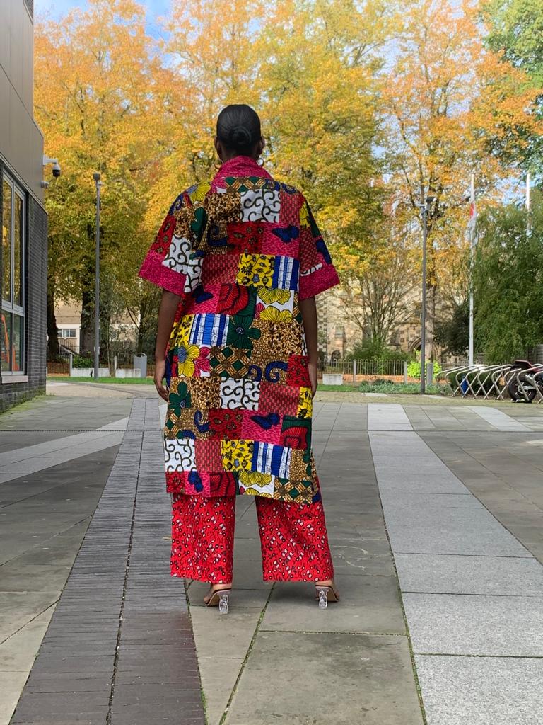 The long jacket in this set complements the Ankara bottoms impeccably. Crafted from the same Ankara fabric, it offers a fusion of traditional and contemporary elements. The length of the jacket provides a sense of sophistication, adding an extra layer of elegance to your outfit. It’s designed with a flattering cut and meticulous attention to detail, making it a versatile addition to your wardrobe. Wear it open for a relaxed look or cinch it at the waist with a stylish belt to create a more tailored appearance.