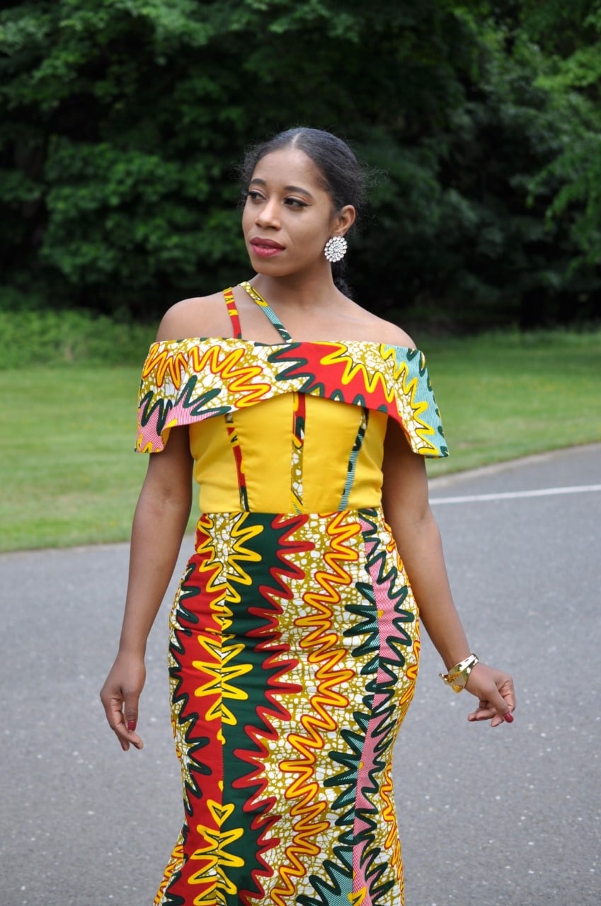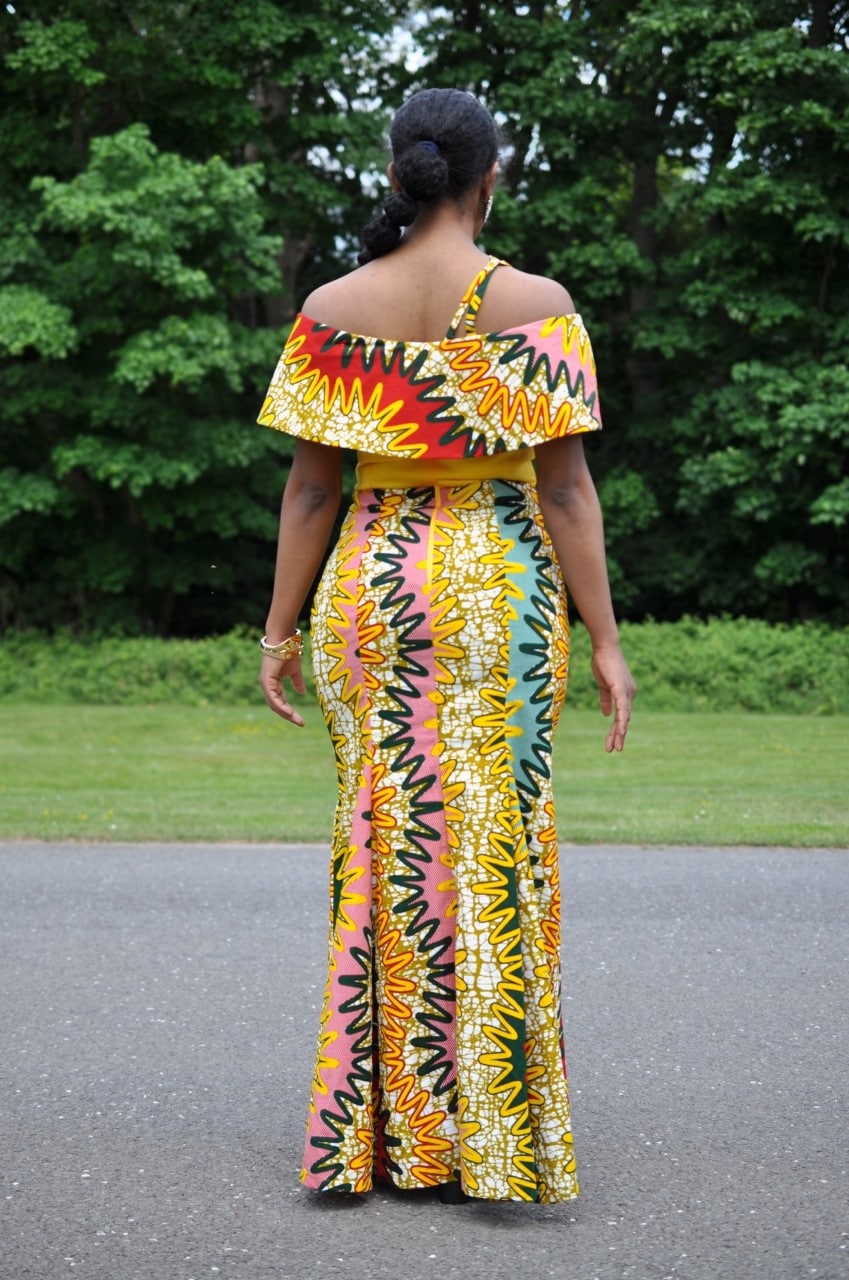 Introducing our stunning Nevaeh African Ankara Multi Occasion Dress. Featuring elegant of the shoulder neckline. In addition the dress has a beautiful bodycon fit, with our beautiful Ankara fabric and mermaid tail design. This dress is a true statement of style and cultural heritage. Embrace the beauty of African fashion and let the captivating Ankara print transform your look into a true fashion statement.
