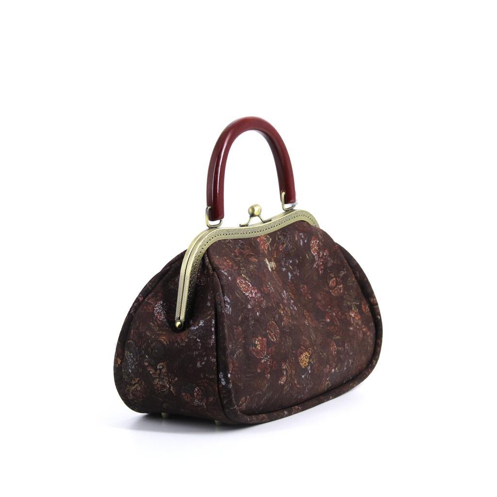 - Exterior: leather, bronze tone frame& floral design (dark red/ browns)