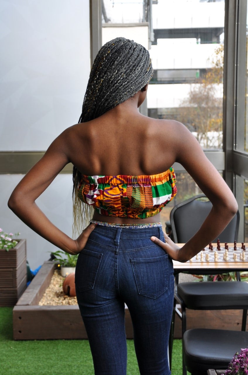 If placing a custom made order for our orange African print bandeau crop top, please include your measurements when ordering, for best fit. For ready to ship orders, please use our measurement guide to help you select the correct size.